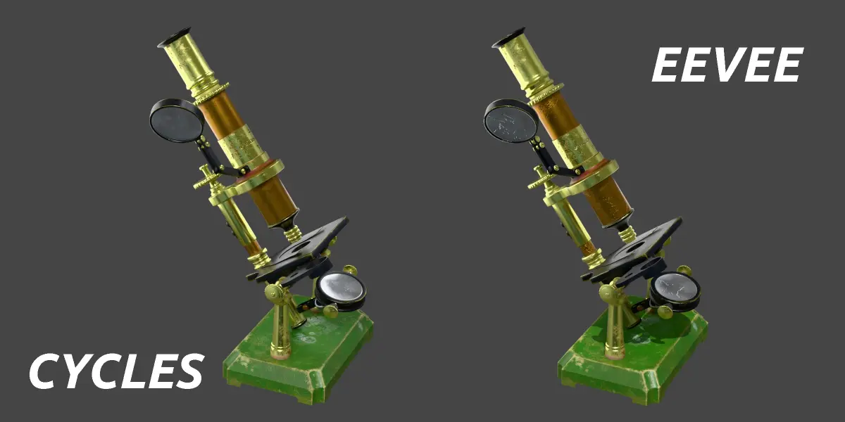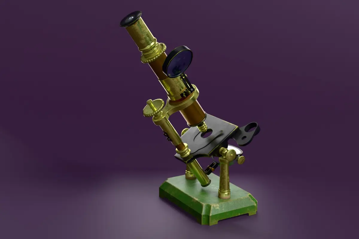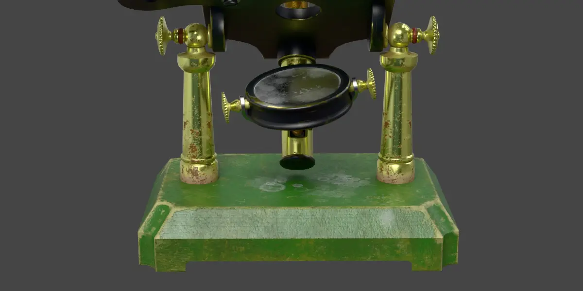 Antique brass microscope from the 19th century. Made in Blender 3D 4.2 (Cycles/Eevee materials). UV Layout maps and Image Textures resolutions: 4096x4096; PBR Textures made with Substance Painter.