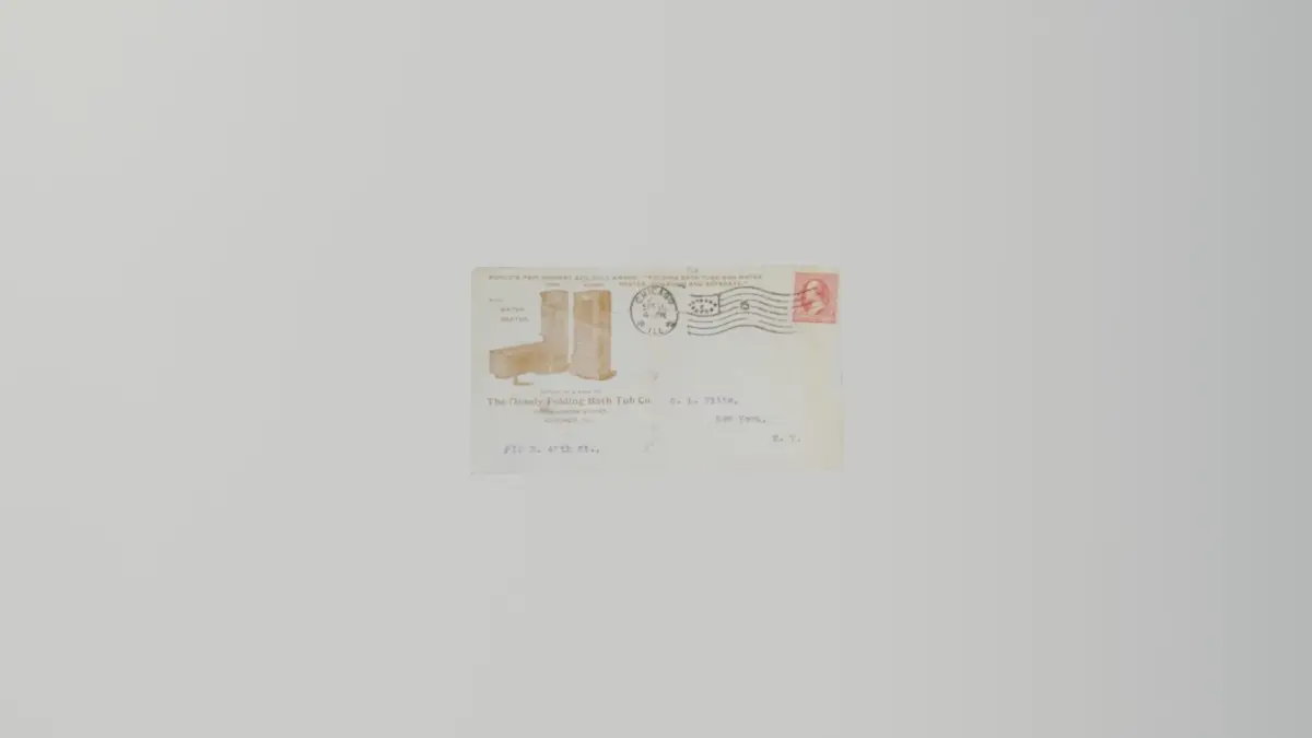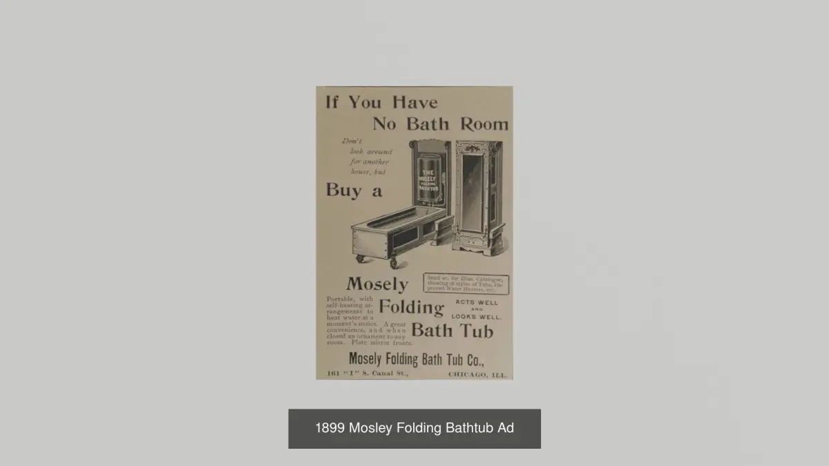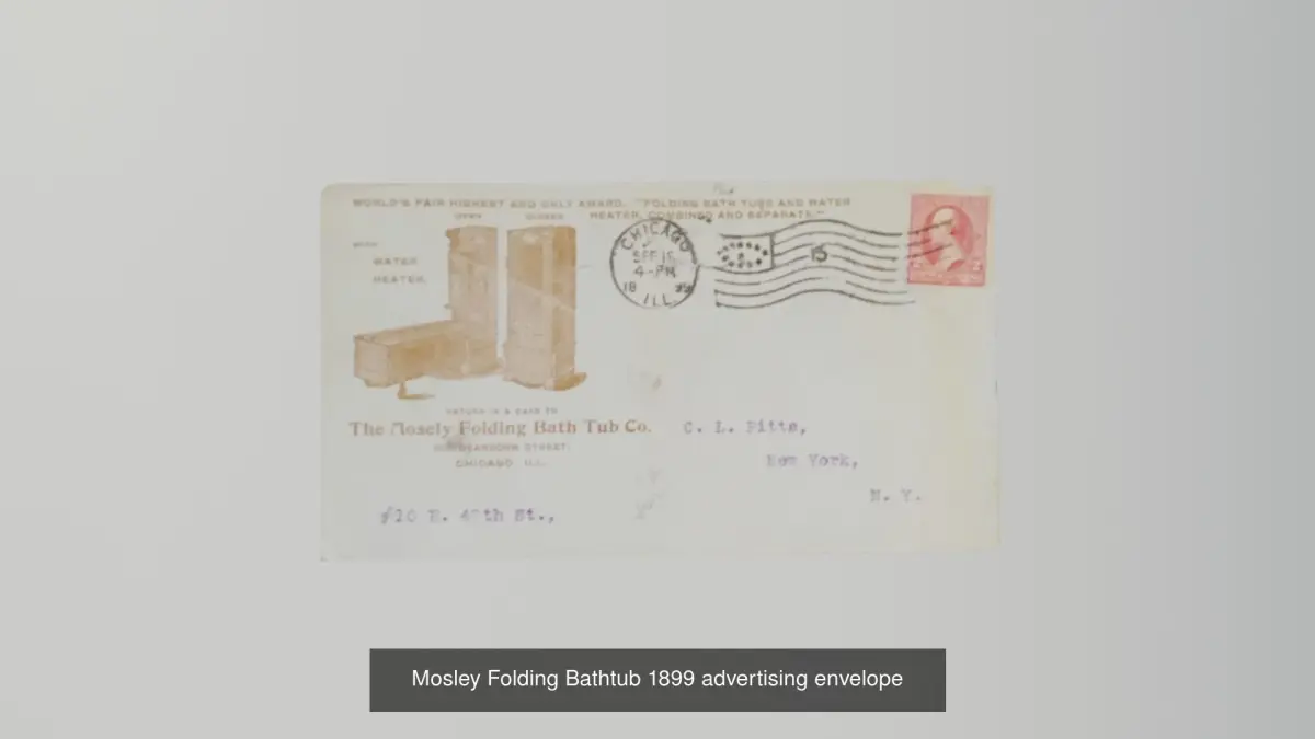 Mosley folding bathtubs where manufactured from 1880 to 1900 as a way to bathe without having all the space needed for a traditional bathtub. They were advertised as A perfectly equipped bath and No Bathroom required. The Mosley Folding Bathtub co. produced 20 styles of bathtubs over the years. For example the Antique Mosley Folding Bathtub Ad in this collection depicts a version where (when closed) it looks like a stand-alone mirror. But the Mosley Folding Bathtub 1899 advertising envelope depicts a version where the mirror does not continue down as far and the empty space is used up by two fake decorative drawers. If you like this model please give it a like and a good review to help others find it.