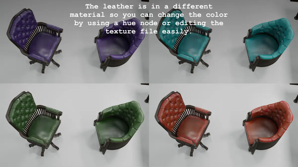 - leather is in a different material so you can change the color using a hue node or changing the texture file hue easily.