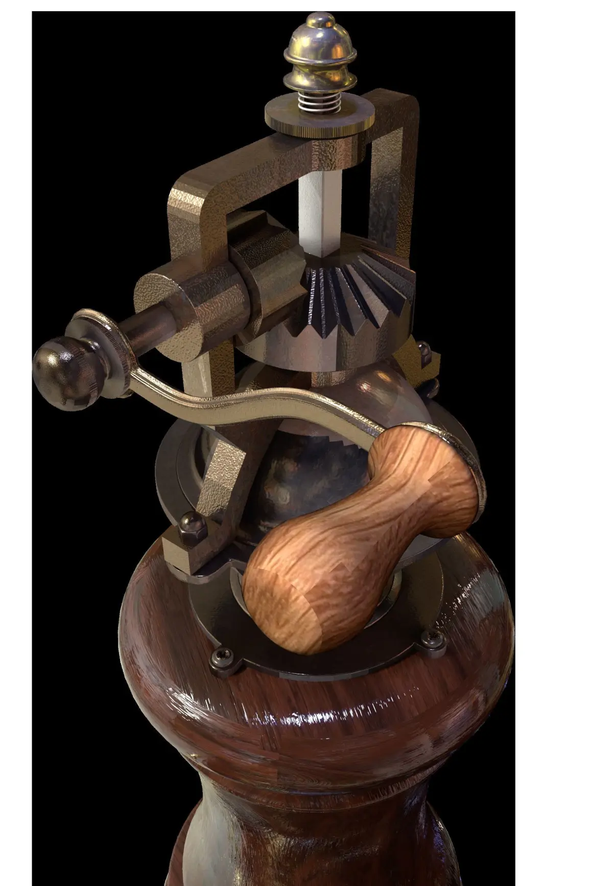 Antique pepper mill for grinding various flavor peppercorns. Originally invented by Peugeot of France in 1840, a flour mill converted into a steel mill. It wasn't until 1905 that Peugot made their first car, the Lion Peugot. Done with Blender 2.79.6 and Cycles render engine.
