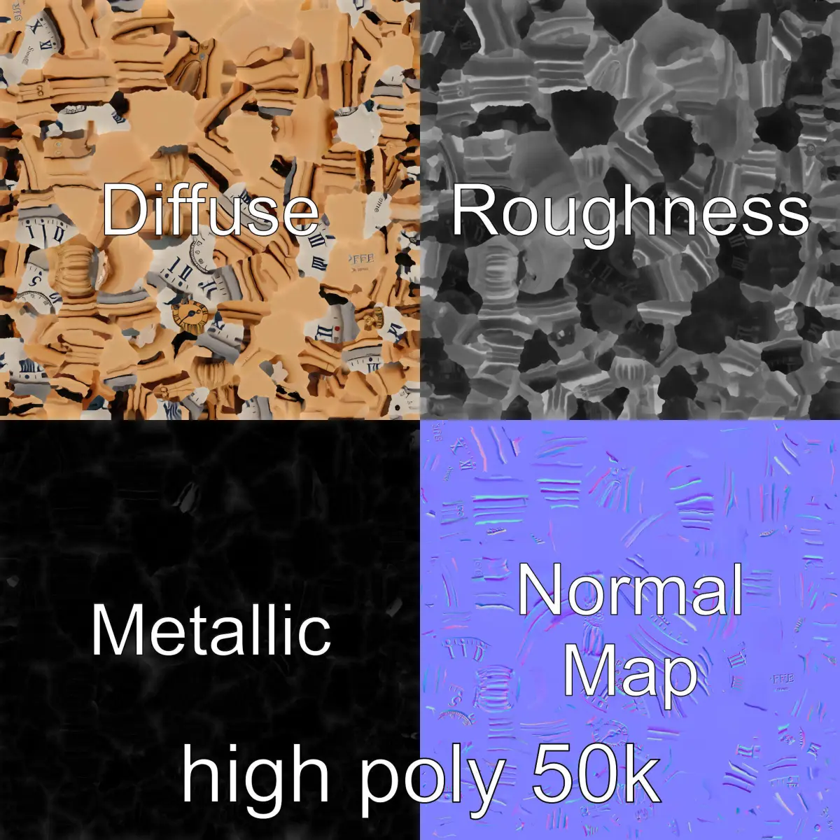 The model's textures are PBR, Diffuse, NormalMap, and reflection/roughness/metallic, suitable for any modern rendering engine. All models are accurately unwrapped with no overlapping UVs, ensuring seamless application of textures.