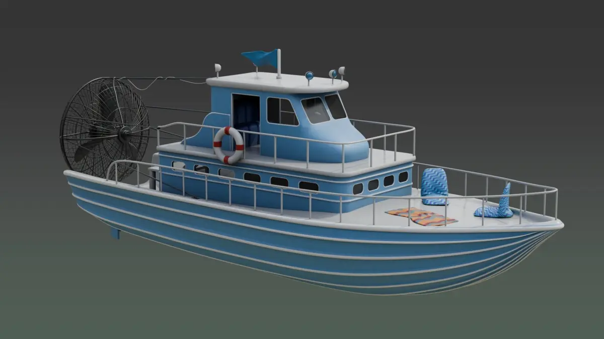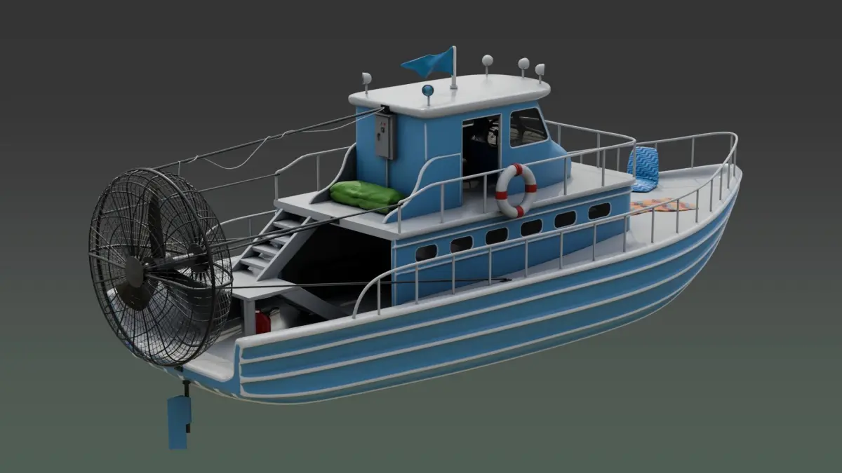 An antique recreational airboat from the historical timeline, featuring a unique design with a wide, round bottom and a sky blue and white striped pattern. The boat's surface is rough to the touch, showcasing its durability for adventurous rides on the water. The high, angular front of the airboat gives it a distinctive appearance, evoking a sense of nostalgia for bygone eras.