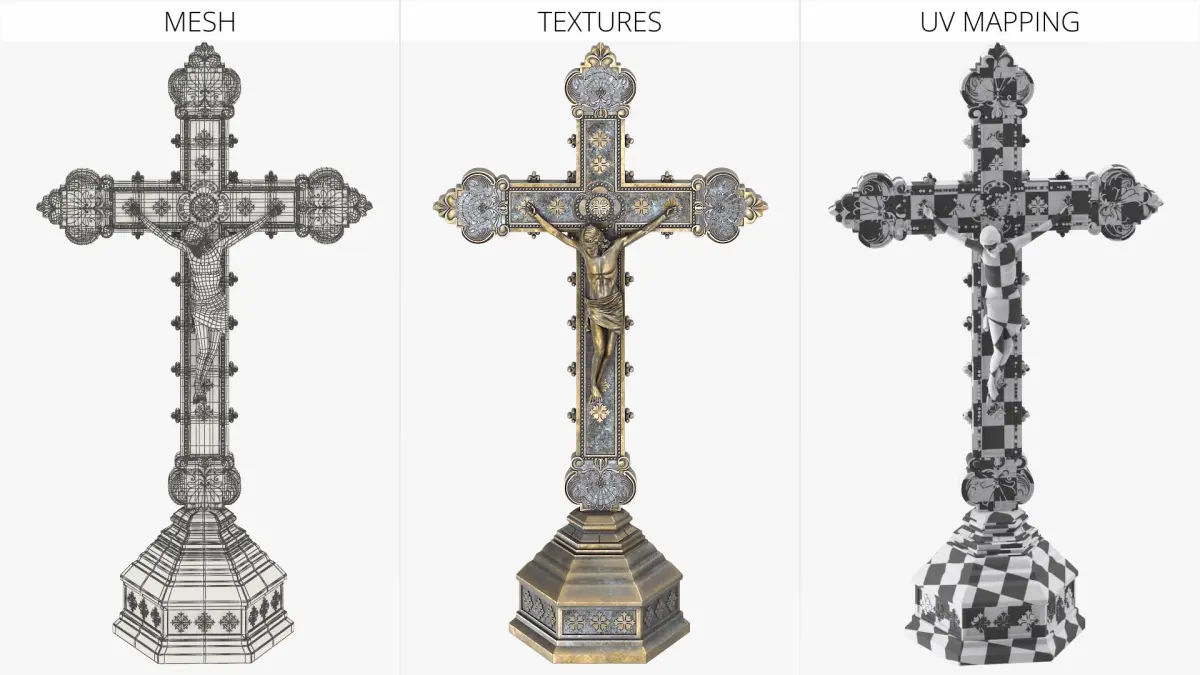 Antique Religious Desk Crucifix Jesus Bronze with Silver is a high quality, photo real 3d model that will enhance detail and realism to any of your rendering projects. The model has a fully textured, detailed design that allows for close-up renders, and was originally modeled in 3ds Max 2020 and rendered with V-Ray. Renders have no postprocessing!