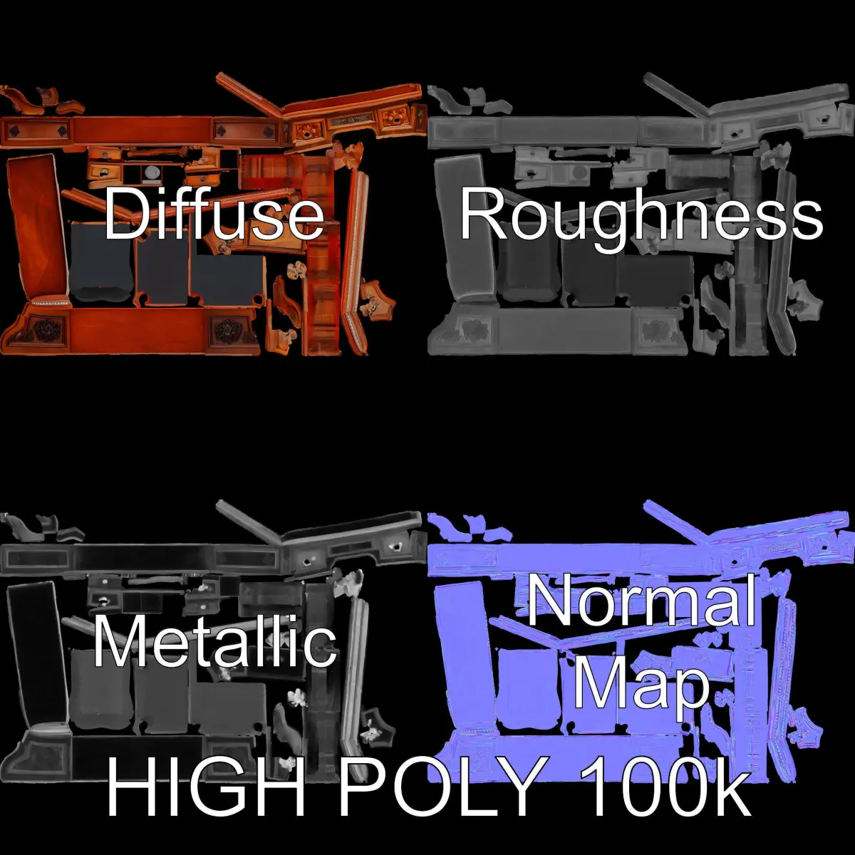 This 3D model pack features a detailed antique roll-top desk with three levels of detail: low-poly (1000 triangles) for mobile, middle-poly (10,000 triangles) for environments, and high-poly (100,000 triangles) for production rendering. The model's textures include PBR, Diffuse, NormalMap, and reflection/roughness/metallic, all at 4096x4096 resolution, making it suitable for any modern rendering engine. It is ideal for architectural visualizations, historical recreations, and interactive presentations. Perfectly unwrapped UVs with no overlaps ensure top-tier quality. The first image is the reference used for creating the 3D model. It is important to carefully evaluate the quality of the model by examining the preview images that display the topology and polygonal mesh. These previews (WIRE and WEB 3D Preview) clearly demonstrate how accurately the model matches the original reference and how well the geometry has been executed. Please like and leave a comment if you find this model appealing.