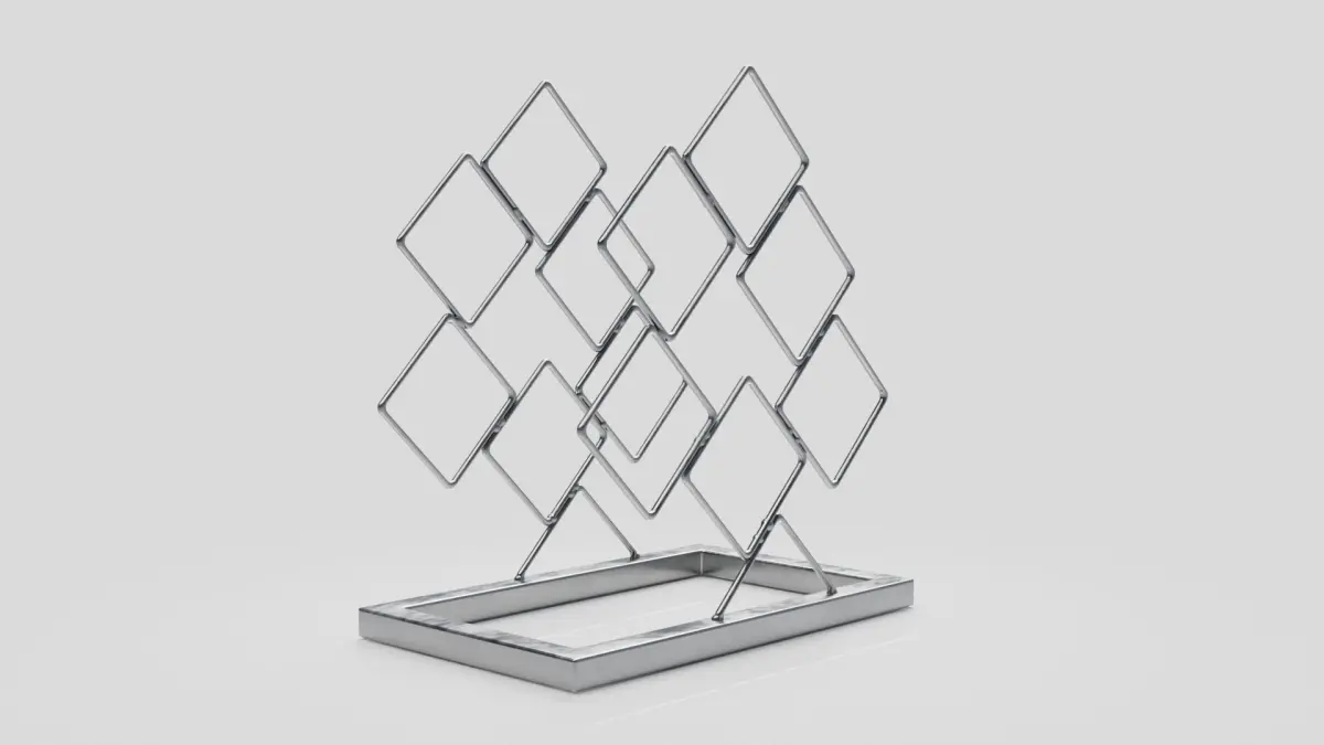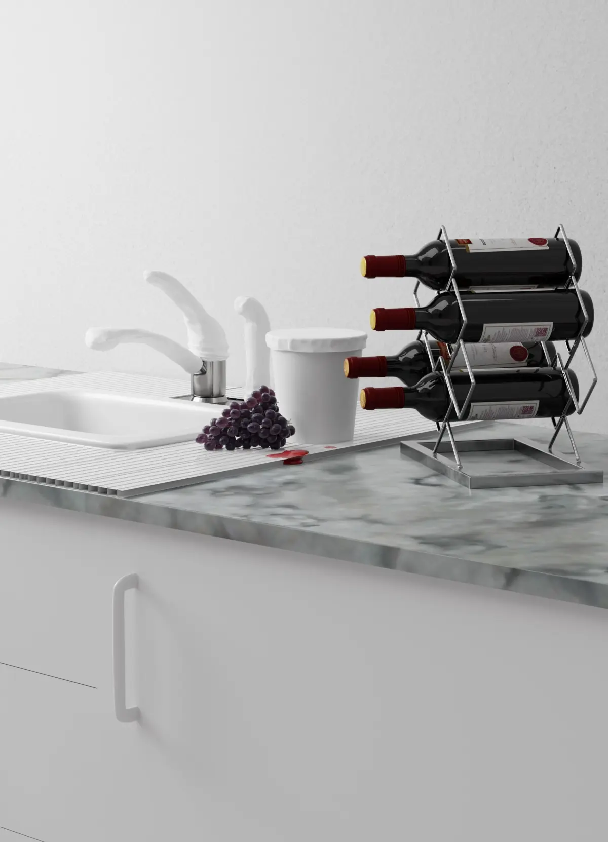 Welded silver wine rack. Can support 6 wine bottles. Perfect for a kitchen scene. Wine bottles not included.Materials not included