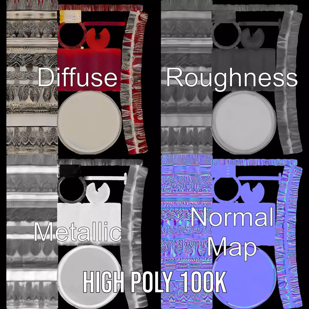 The Antique Silver Candlestick model pack features an elegant, intricately detailed candlestick with a rich silver finish. Each model has 3 levels of detail: low-poly (1000 triangles for mobile), middle-poly (10,000 triangles for environment), and high-poly (100,000 triangles), which allows for the use of this model in production rendering (such as 3ds Max, Maya, Cinema4D, Blender, Vray/Corona/Cycles, and all others), game engines (Unity and Unreal compatible), and interactive presentations, providing a choice of detail based on the LOD system principle. Ideal for historical recreations, home decor visualizations, and thematic games. The model's textures are PBR with Diffuse, NormalMap, Reflection, Roughness, and Metallic maps, suitable for any modern rendering engine. All models accurately unwrapped with no overlapping UVs. All textures are 4096*4096 in size. We invite you to like and leave a comment if you enjoyed the model.