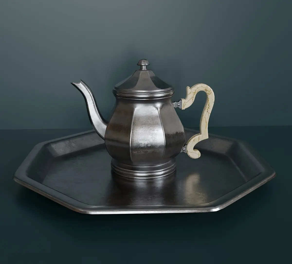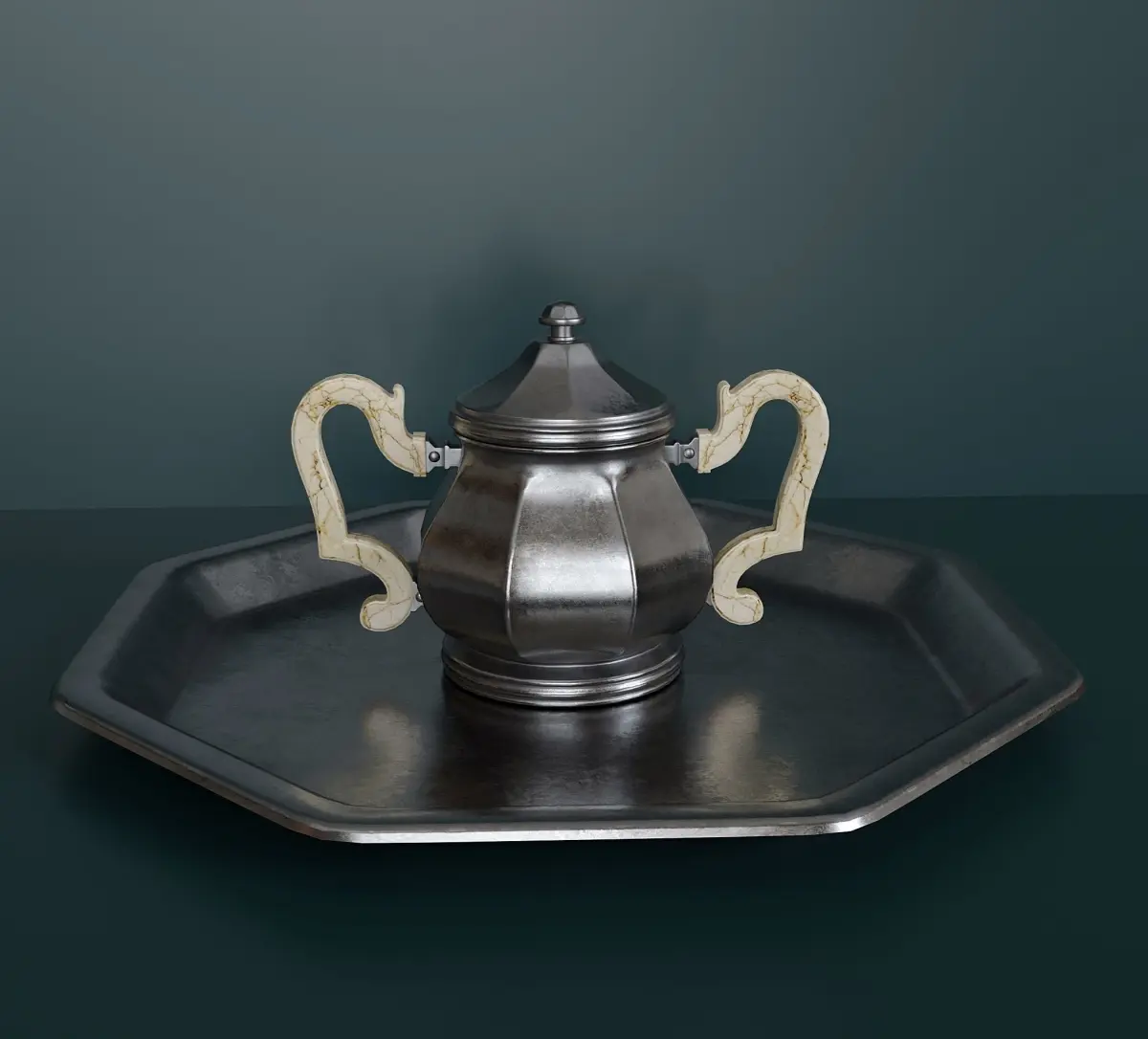 Antique 3 piece silver tea set. Teapot, sugar bowl, creamer and three lids (interactive) for all items. + Silver tray. Materials baked in substance painter:(in zip archive)base colorheightmetallicmixed AOnormalnormal open GLroughness Material for handles separate texture (in a separate archive)