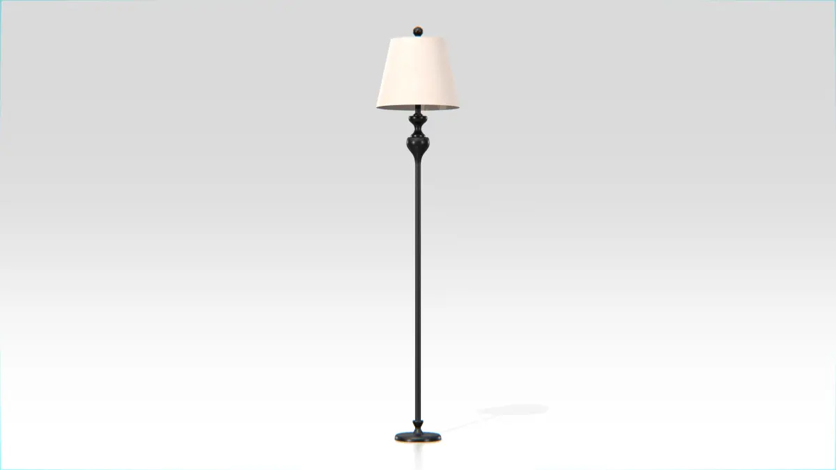 This elegant floor lamp features a slim black metal pole and a rounded base topped with a soft beige fabric lampshade. The upper section of the lamp includes a detailed ornamental connector that adds a classic charm to the silhouette. The lampshade is supported by a black metal spider frame, revealing a visible bulb socket when viewed from above.