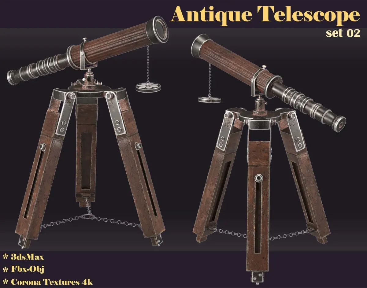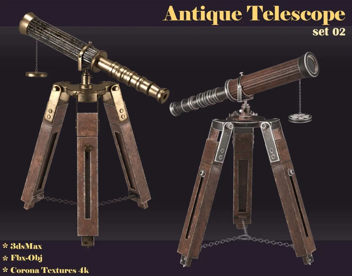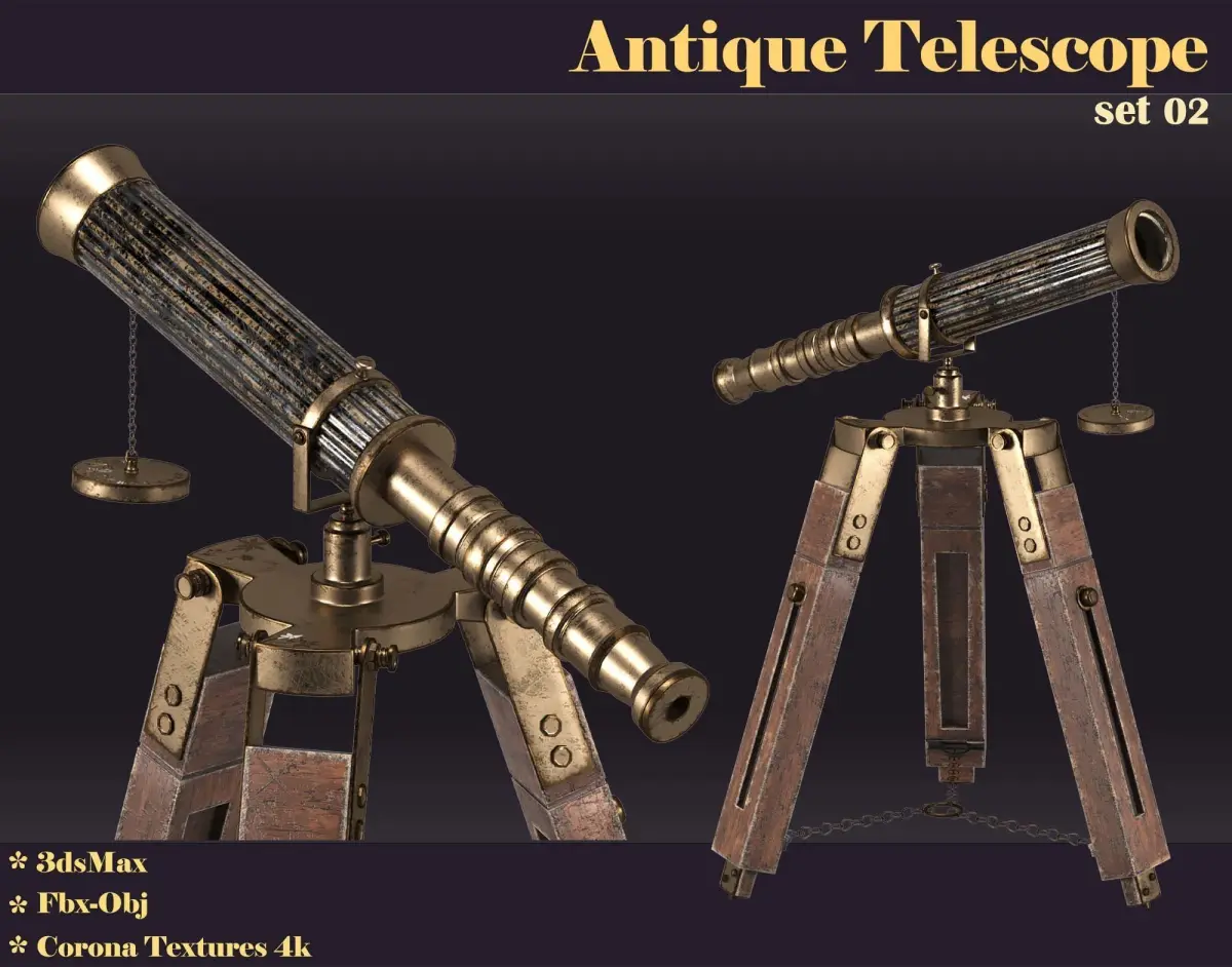 Add a touch of vintage elegance to your projects with this meticulously crafted 3D model of an antique telescope. Modeled in 3ds Max and available in FBX and OBJ formats, this asset includes high-resolution 4K Corona textures for exceptional realism and detail. This model comes with two material variations, allowing for versatility in various scenes and design styles. Perfect for use in animations, interior designs, architectural visualizations, and even product showcases, this telescope model serves as a decorative piece that enhances any classic or luxurious theme. Its timeless design makes it a standout feature in vintage settings, adding an air of sophistication and charm.