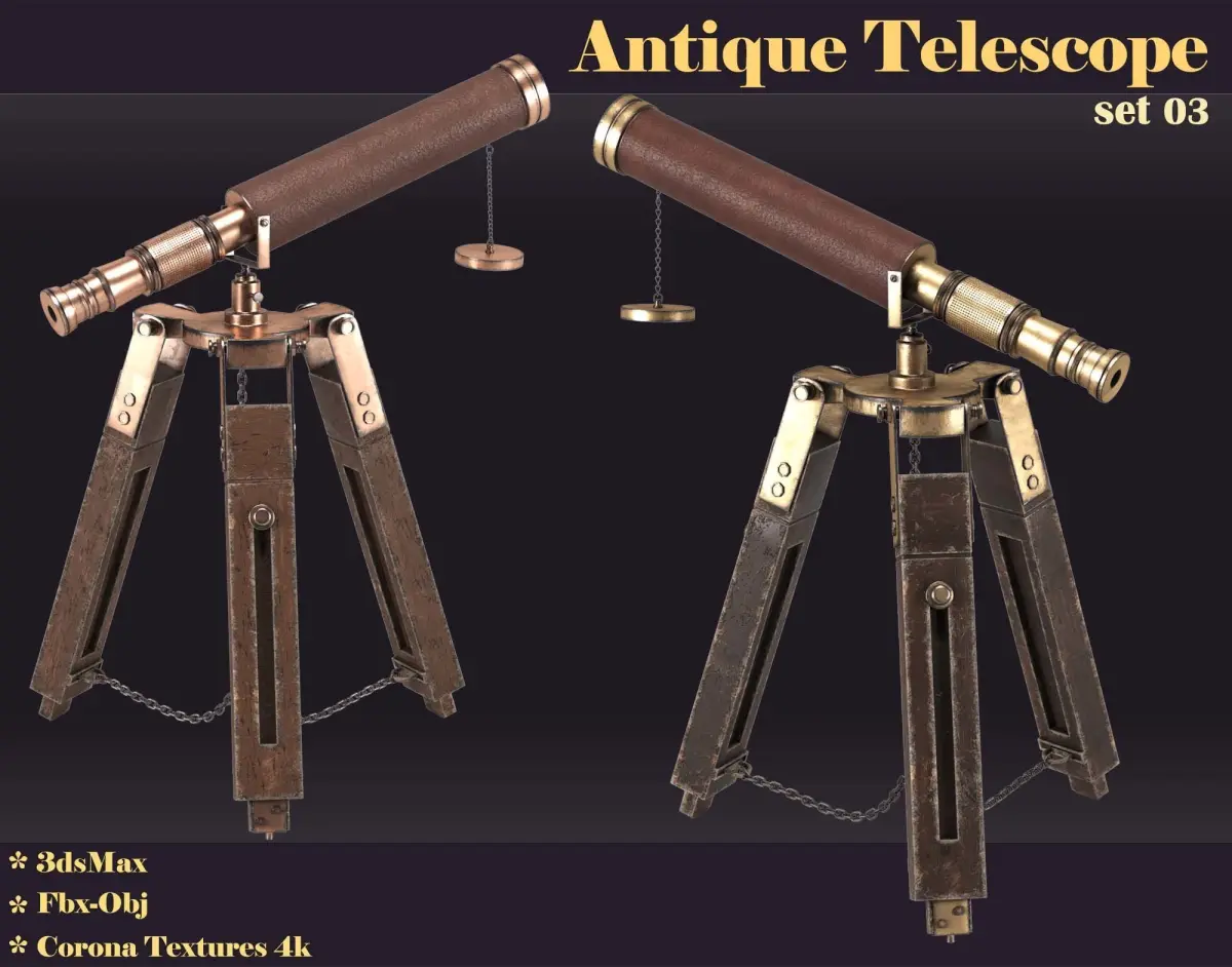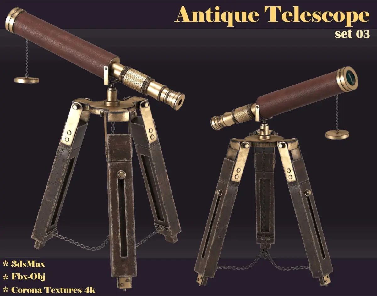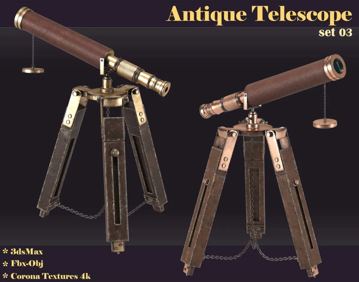 Add a touch of vintage elegance to your projects with this meticulously crafted 3D model of an antique telescope. Modeled in 3ds Max and available in FBX and OBJ formats, this asset includes high-resolution 4K Corona textures for exceptional realism and detail. This model comes with two material variations, allowing for versatility in various scenes and design styles. Perfect for use in animations, interior designs, architectural visualizations, and even product showcases, this telescope model serves as a decorative piece that enhances any classic or luxurious theme. Its timeless design makes it a standout feature in vintage settings, adding an air of sophistication and charm.
