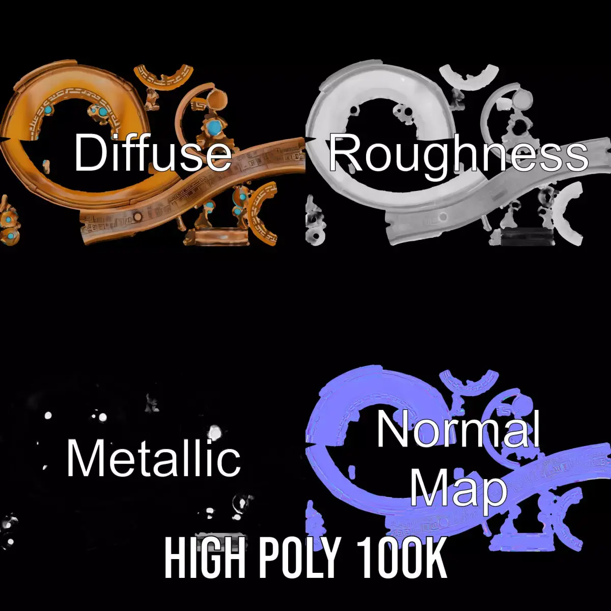 This antique turquoise pendant model combines intricate detailing with elegant design, making it perfect for historical recreations, jewelry design, or fantasy settings. Each model has 3 levels of detail: low-poly (1000 triangles for mobile), middle-poly (10,000 triangles for environment), and high-poly (100,000 triangles), which allows for the use of this model in production rendering (such as 3ds Max, Maya, Cinema 4D, Blender, Vray/Corona/Cycles and more), game engines (Unity and Unreal compatible), and interactive presentations, providing a choice of detail based on the LOD System principle. Ideal for use in virtual museums, jewelry showcases, and fantasy game settings. The model's textures are PBR, Diffuse, NormalMap, and reflection/roughness/metallic, which are suitable for any modern rendering engine. All models are accurately unwrapped with no overlapping UV. Thank you for considering this model; please like and leave a comment if you enjoyed it. All textures are 4096*4096 in size.