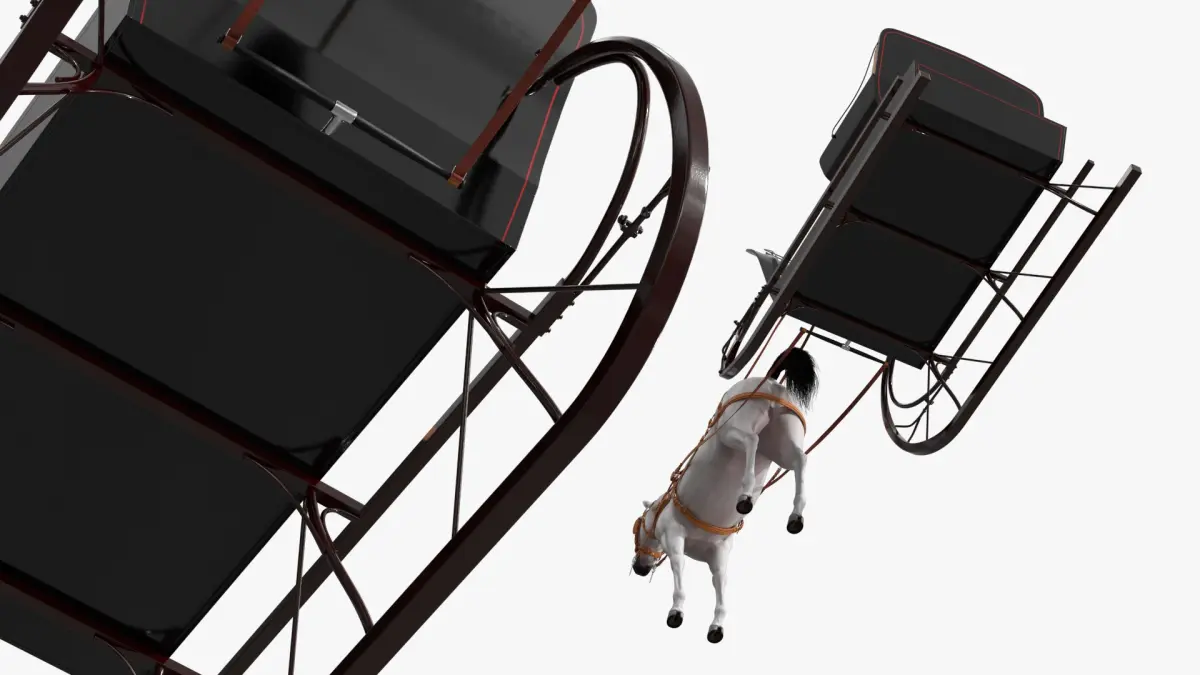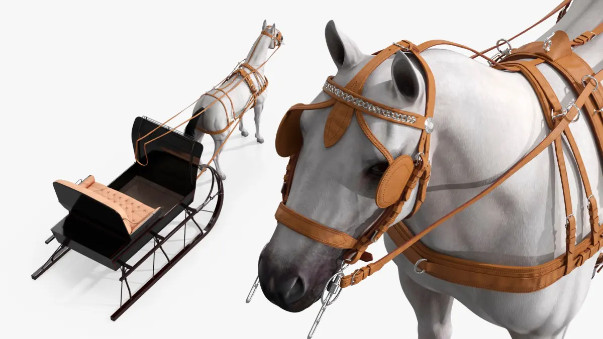 Antique Winter Sleigh with Harnessed Horse is a three-dimensional model of traditional winter carriage, that is a classic sleigh coupled with a horse, often seen in snowy landscapes and festive settings.