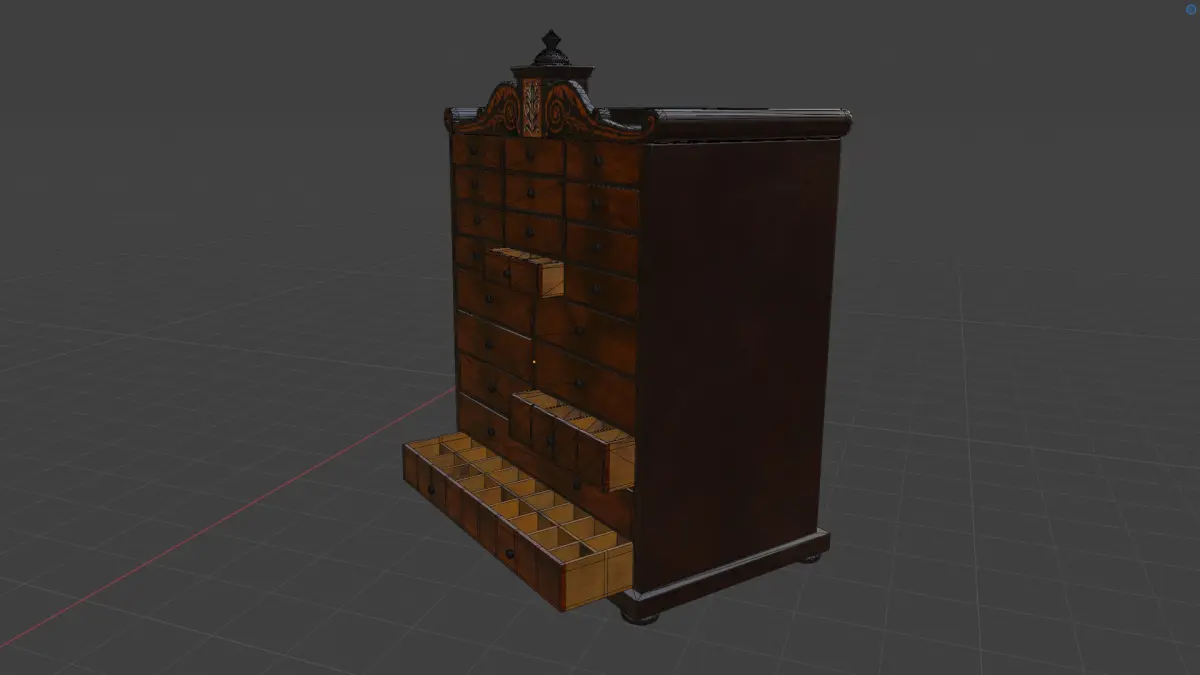 Great for creating an authentic atmosphere in a room. Contains small cells in drawers for small items. If used for games or animation, the open drawers can be closed