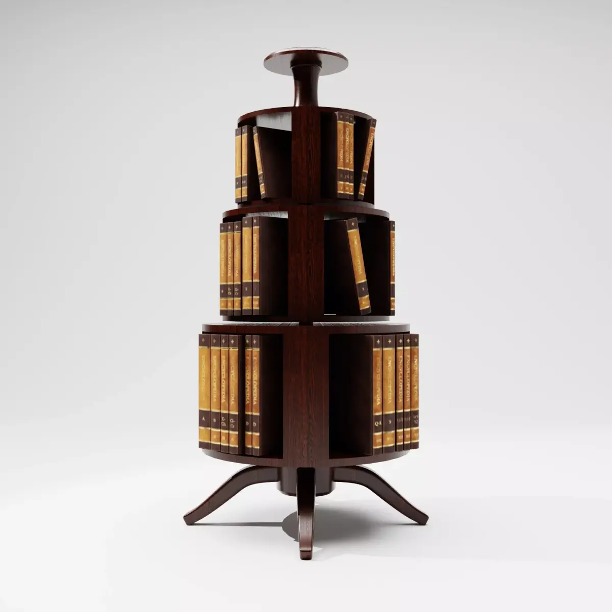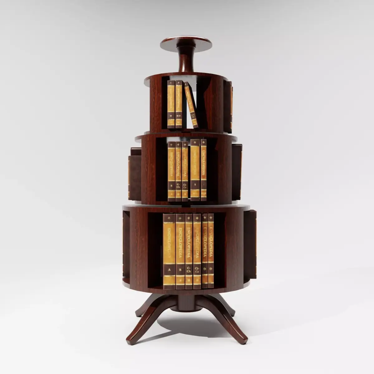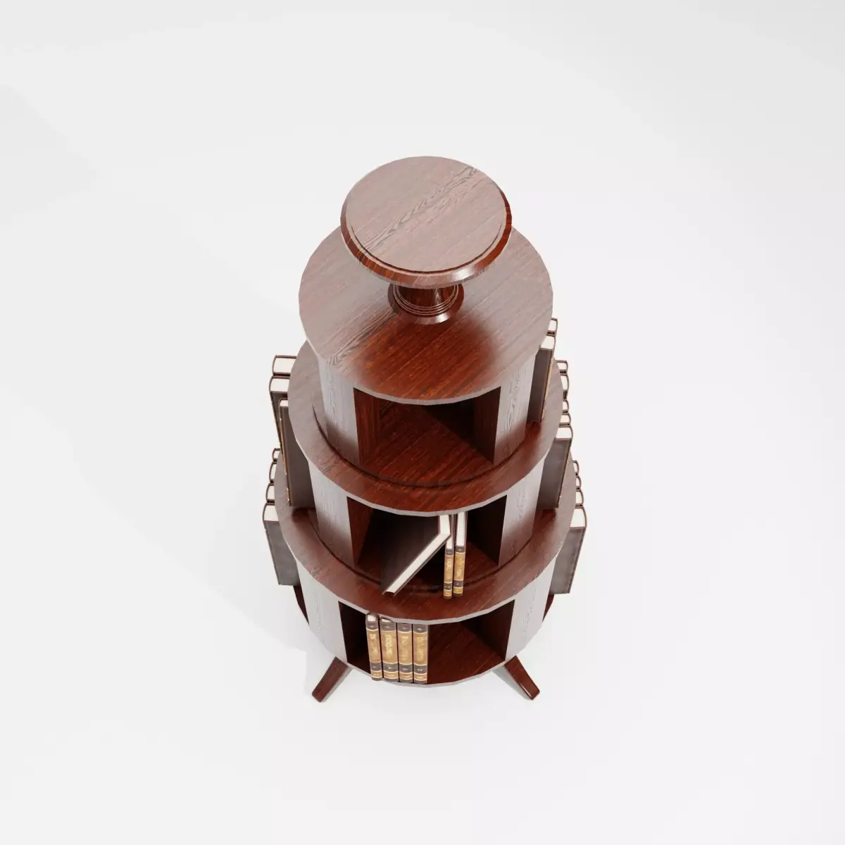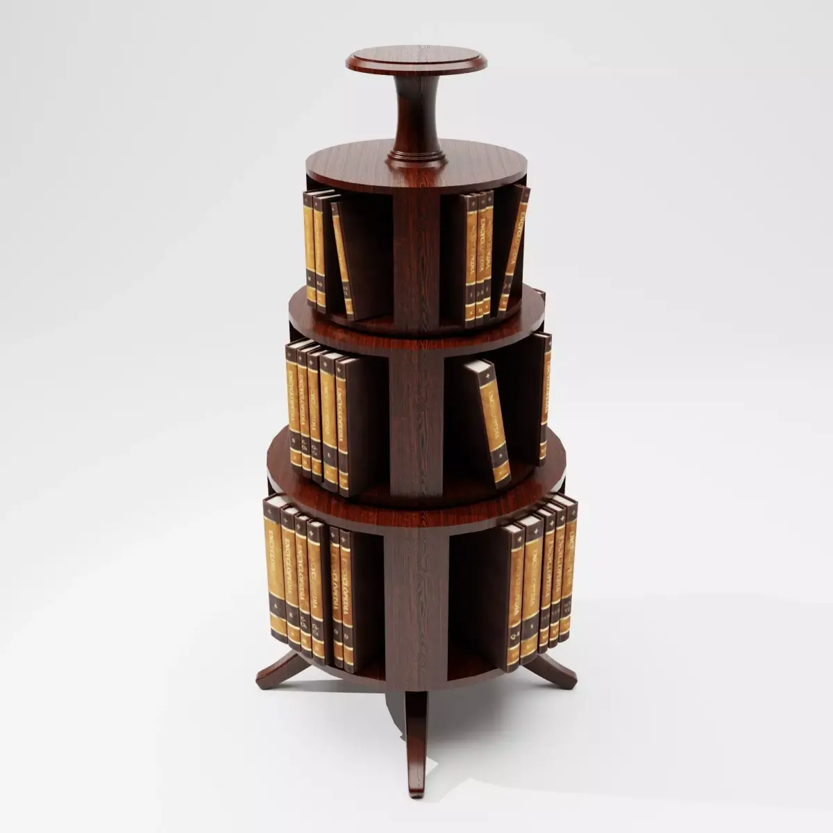 This Antique Wooden Book Stand 3D Model is a piece of classic library furniture, inspired by traditional rotating bookcases and vintage reading stands. The model features tiered circular shelves, rich dark wood material, and an elegant pedestal base, making it ideal for historical interiors, libraries, studies, and period environments.