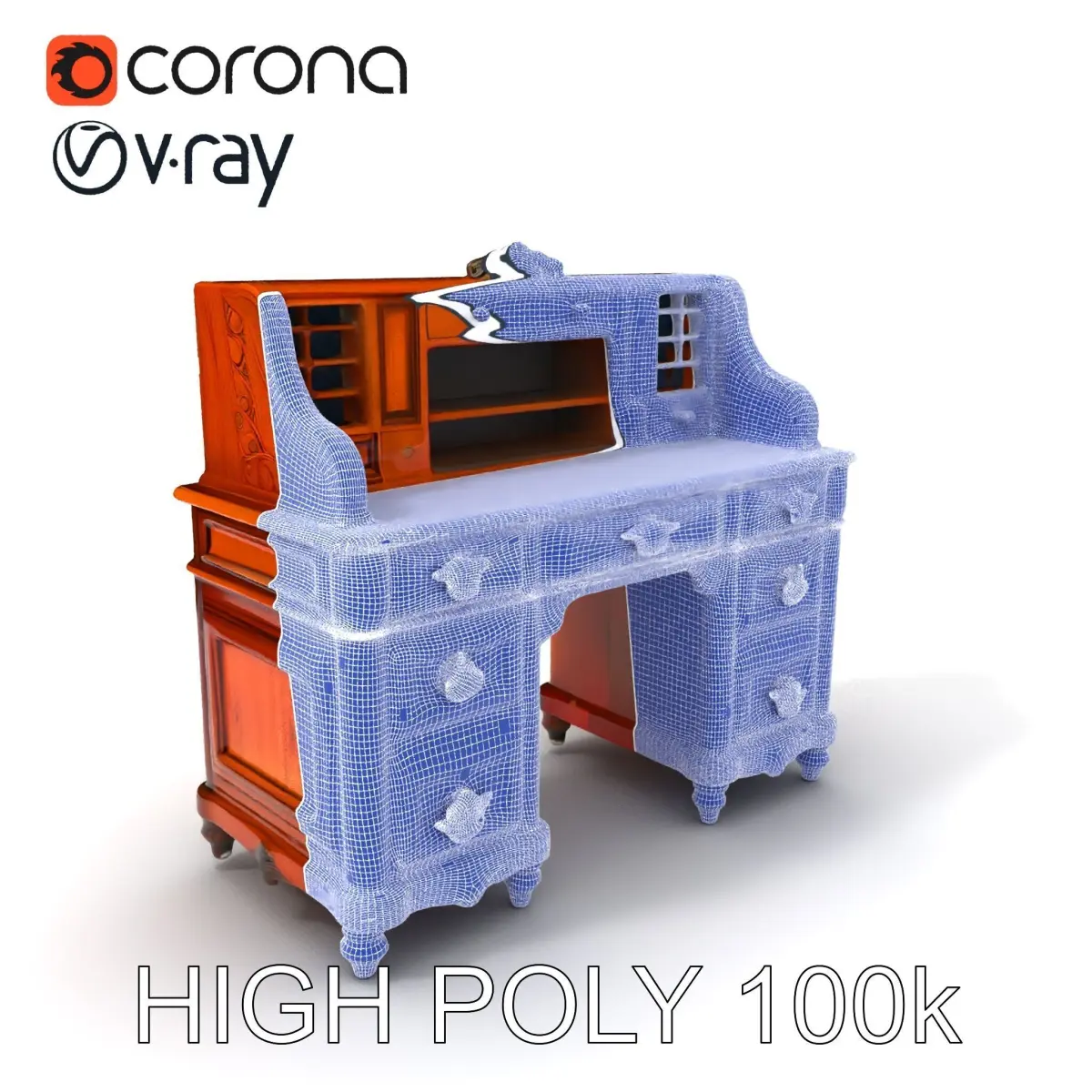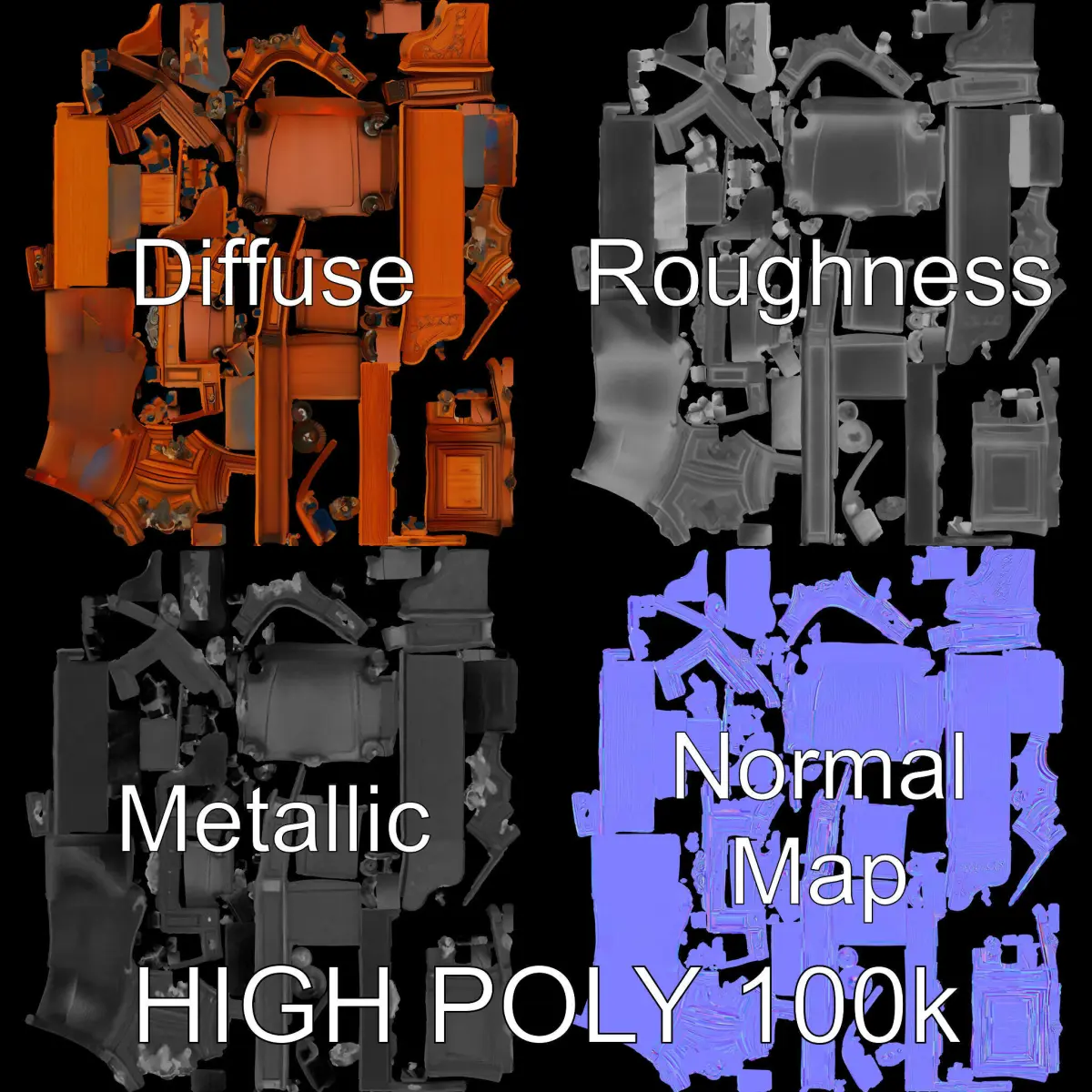 This 3D model pack of an antique wooden desk provides three levels of detail appropriate for varied uses across production rendering, gaming, and interactive presentations. Its intricate carvings and classic design make it ideal for historical settings in films, architectural visualizations, or virtual reality experiences. The model is enriched with PBR textures, including Diffuse, NormalMap, and reflection/roughness/metallic maps, ensuring compatibility with modern rendering engines. All textures are in 4096x4096 resolution, guaranteeing high-quality visuals across different platforms. Additionally, the model is precisely unwrapped with no overlapping UVs to facilitate detailed texturing.
