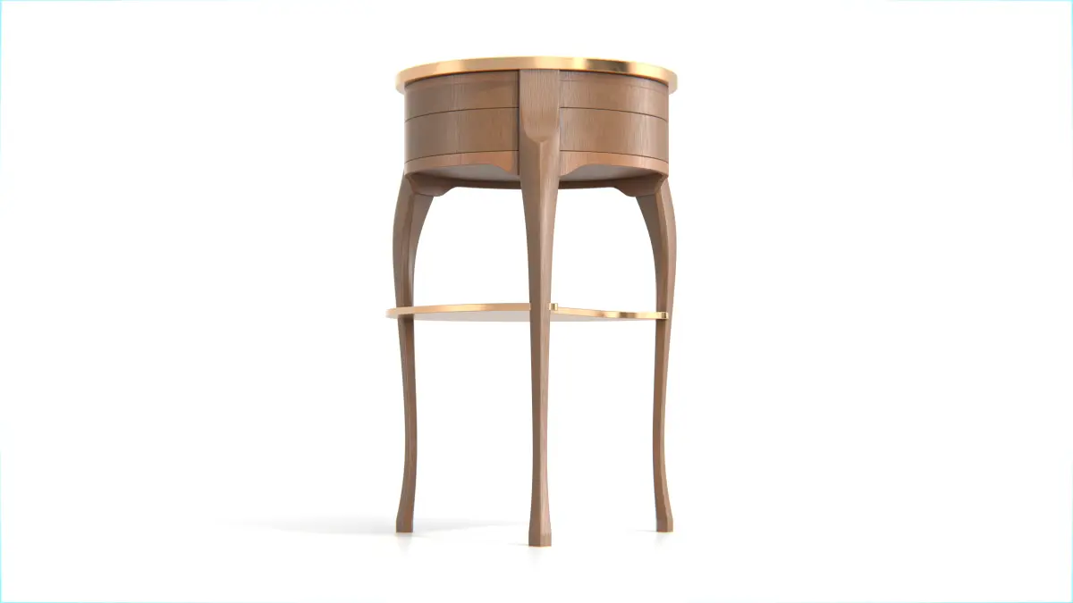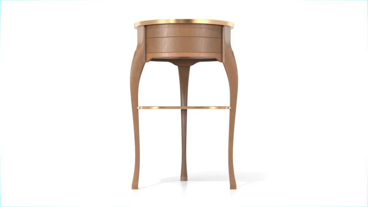 Crafted with soft curves and a warm wood finish, the piece exudes vintage charm, while the metallic brass edging adds a refined touch of contrast. The overall structure is clean and well-detailed, suitable for interior visualization, classic furniture scenes, or product showcase projects.