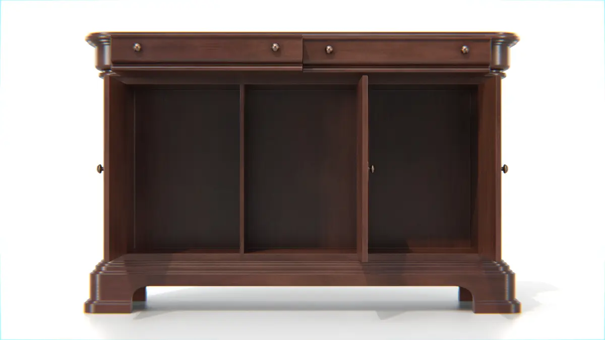 The model includes clean interior compartments behind each door and fully modeled drawers, all with functional hinges and realistic depth, making it suitable for open-close animations or static scenes.