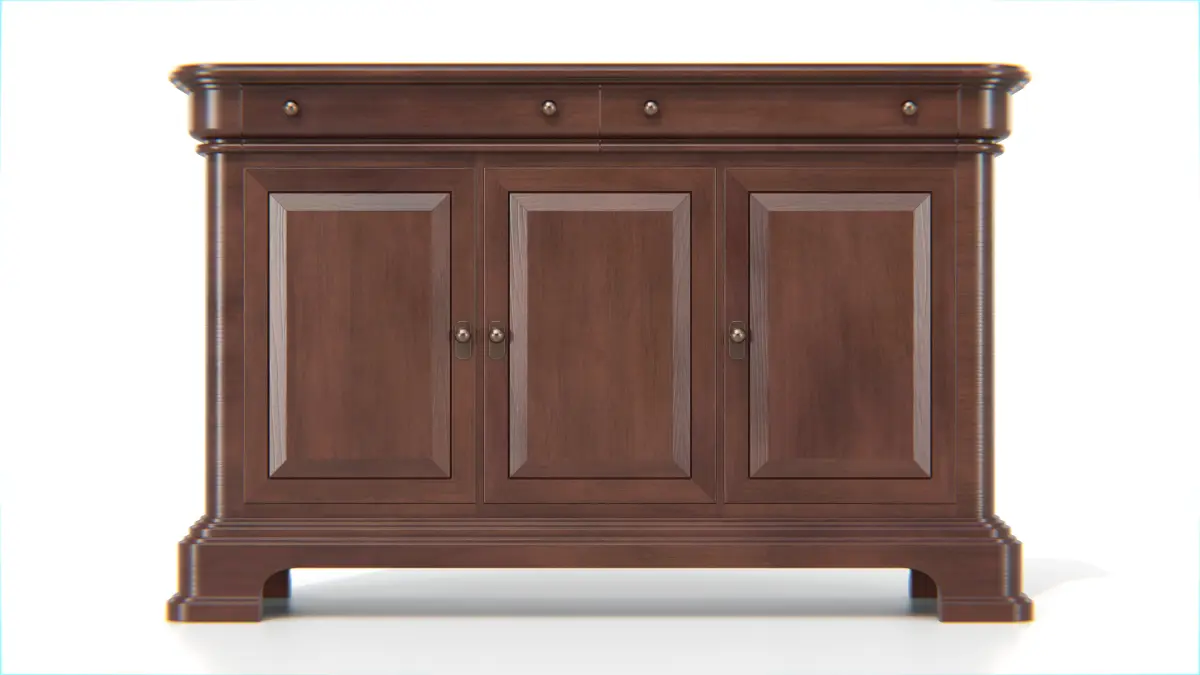 This classic-style sideboard cabinet features a solid dark wood structure with an elegant carved base, three framed panel doors, and two wide top drawers accented with four round metal knobs for balanced aesthetics.