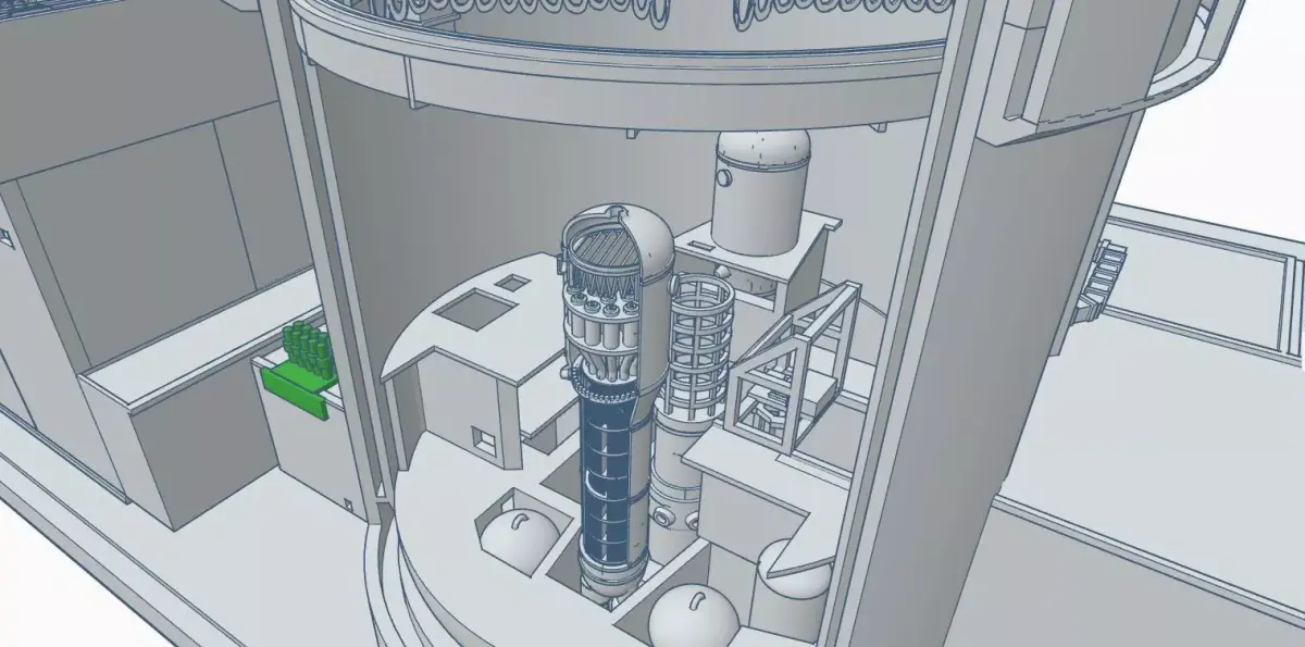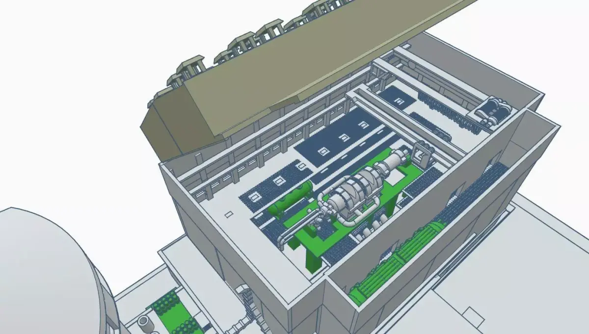 This is a detailed demonstration model of a power unit with an AP1000 reactor. It features a cross-section of the reactor and turbine compartments, showcasing the main technological equipment.The model and stand measure 600 mm in width, 900 mm in length and 350 mm in height.