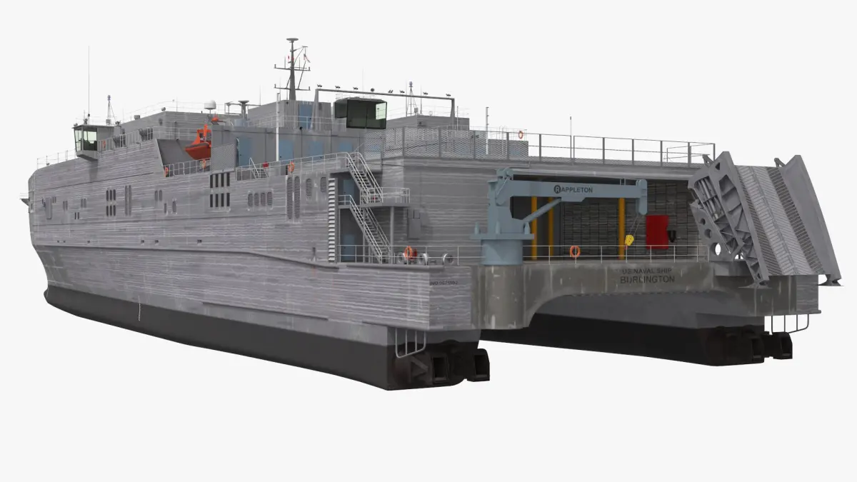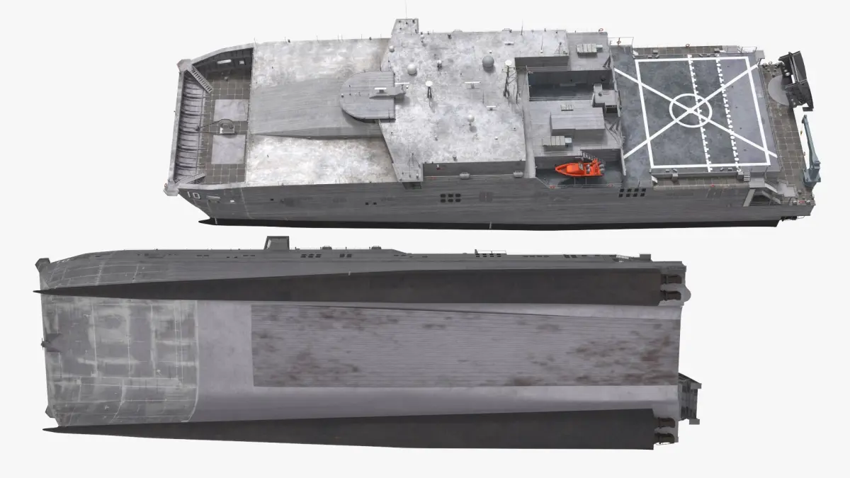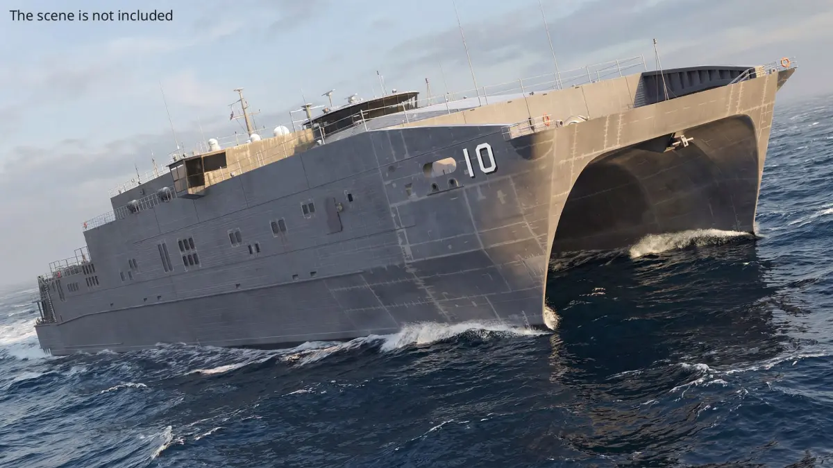 This detailed model showcases the vessel's sleek, aluminum hull structure, expansive deck space, and advanced propulsion systems. It highlights key features such as the flight deck, open vehicle decks, and ramp for fast loading and unloading, providing a realistic representation of its design and functionality.