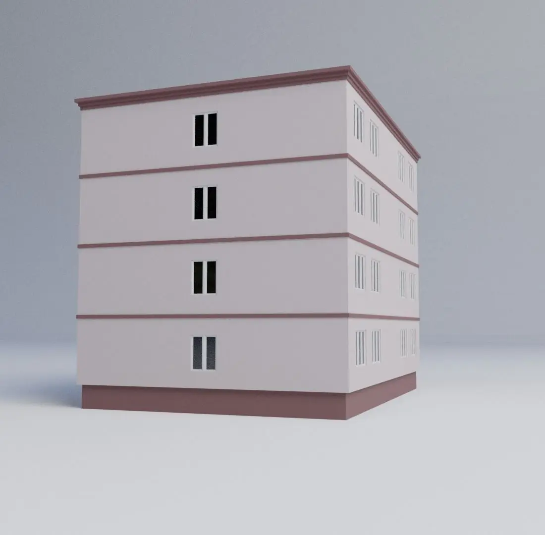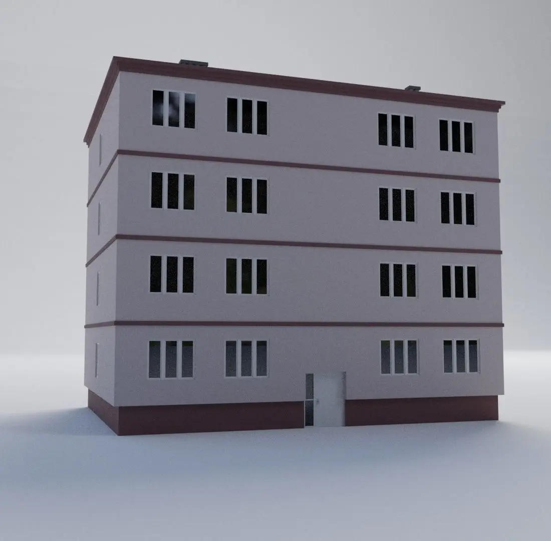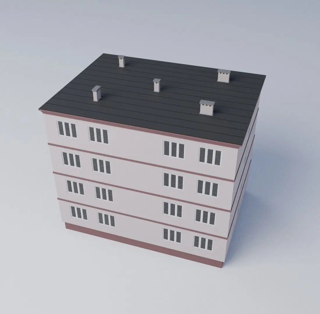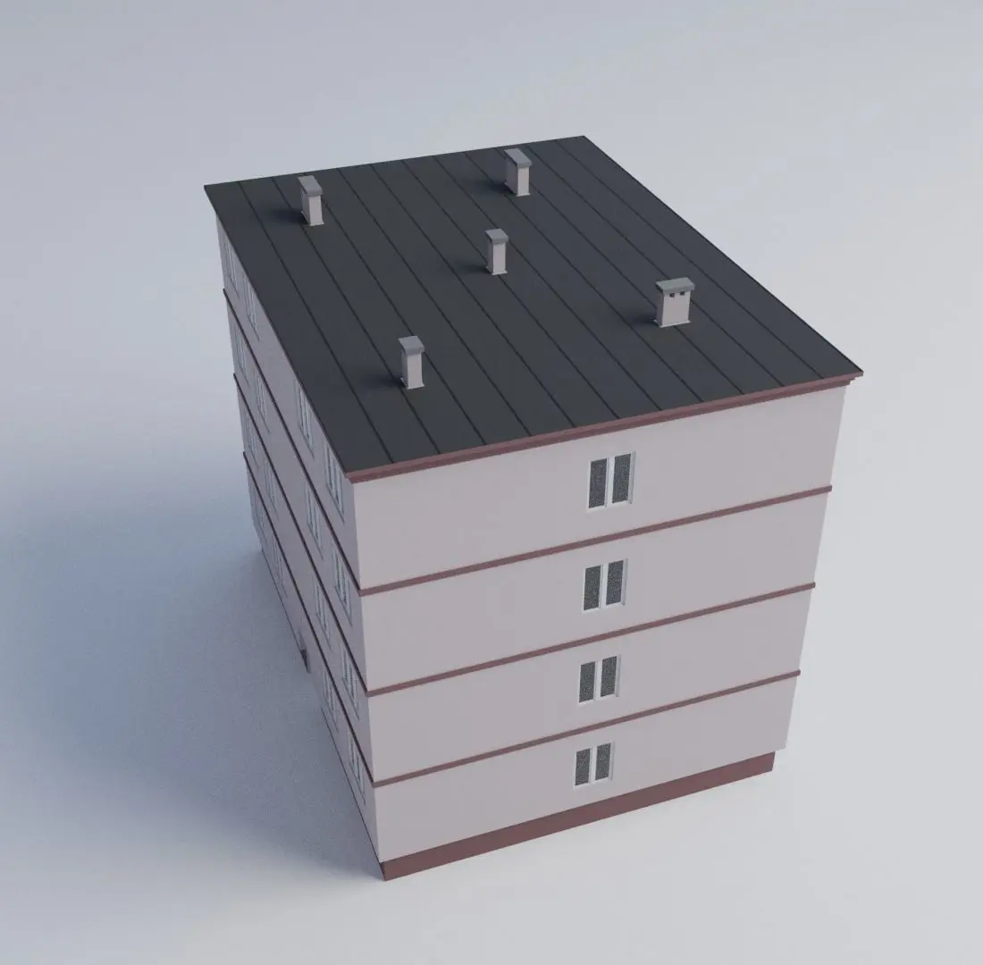 There are 7 materials: six are solid, one uses textures - roof (diffuse map, roughness map, normal map)Textures resolution is 2048x2048. Inside of the building is not modeled.