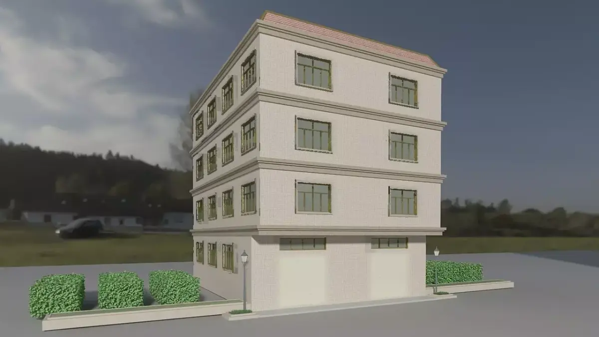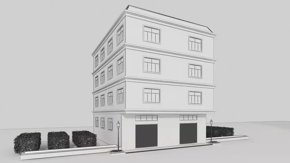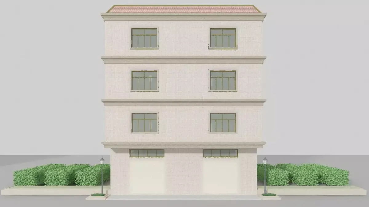 Exterior scene of a 4-floor apartment building. Bushes are vrmesh.