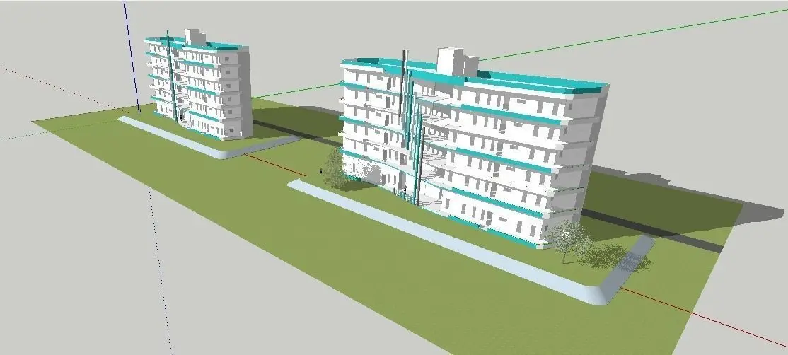 This apartment building consists of 2 units per floor. Each unit has an area of 35m^2. In each unit you can find 2 bedrooms, 1 master bedroom with walk-in closet and private restroom, 2 balconies, living area with restroom and a kitchen. The building has an elevator shaft and a staircase with roof access. the roof can be used as social space, storage, or garden.