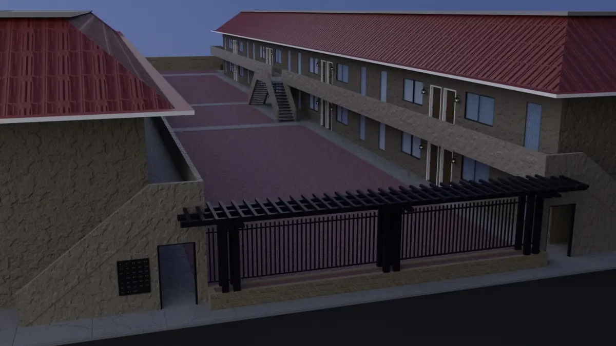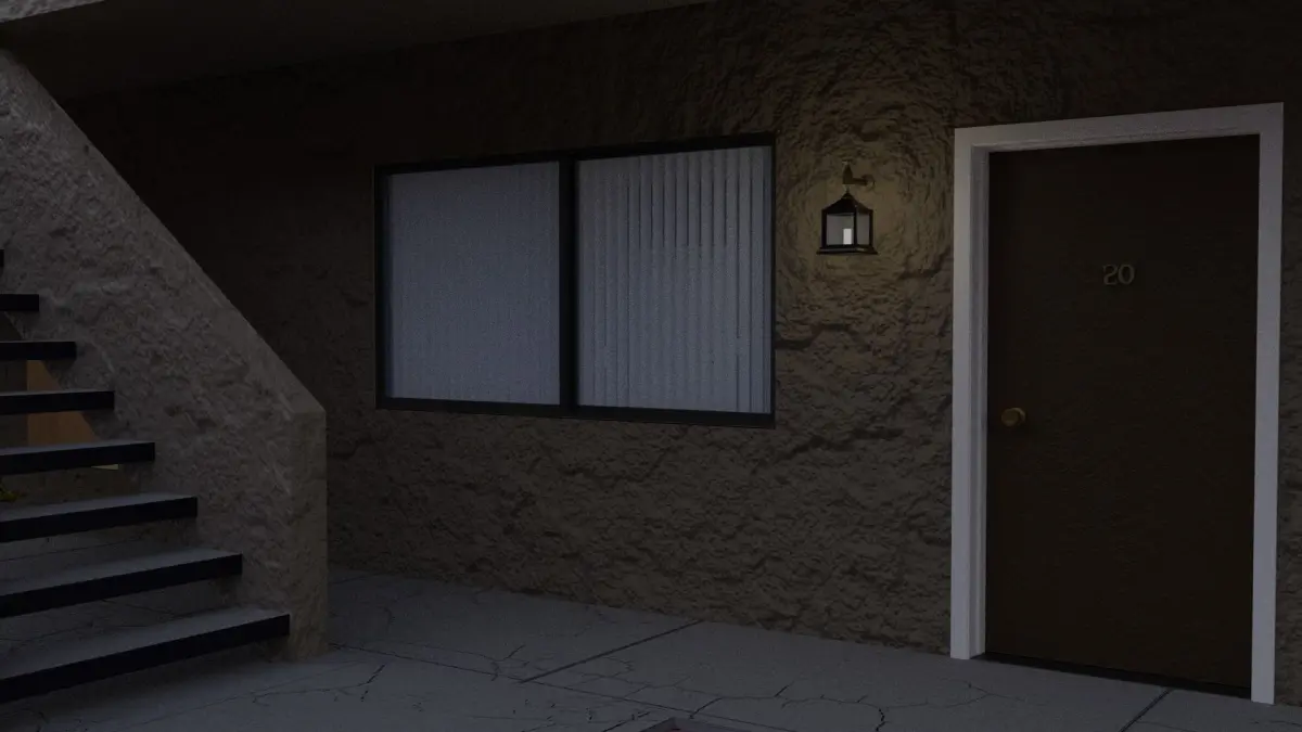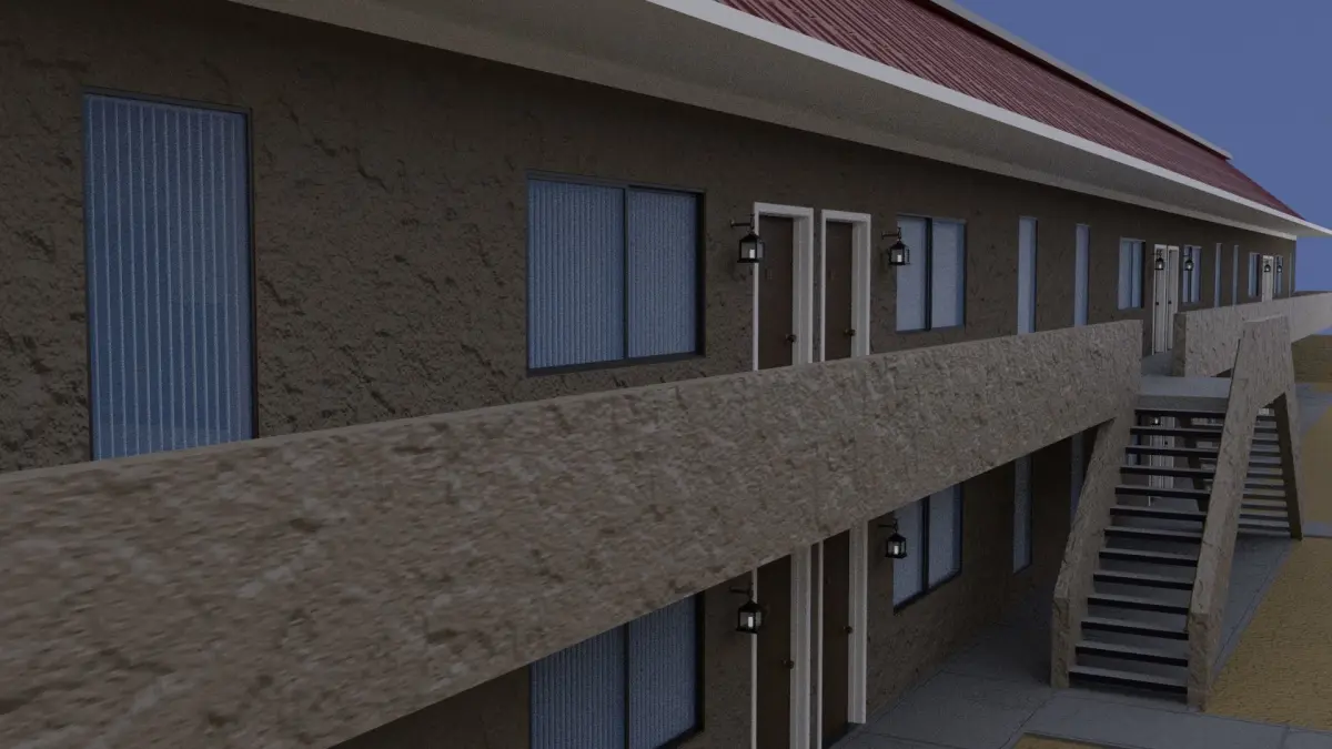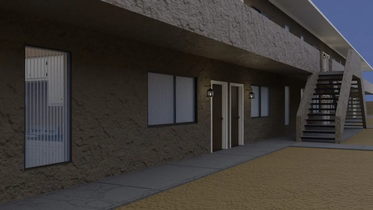 Complete 32 Unit Apartment Complex Not Haunted*In the style of low-rent modern wild west apartment buildings (found in Reno or Vegas), ready for move in same day!2 buildings, with 2 floors each, 8 units per floor. Each front door has its number carved in wood and glued on. Mailboxes on the front of the building have matching numbers. Each apartment has all the standard fixtures and appliances, even a luxurious ceiling fan. All doors, including cabinets, oven, and fridge, open on the proper rotation from the hinge side. Light switches for each light fixture, and power outlets in each room where you'd generally expect to find them.The .blend file has the texures packed into it, and the textures.zip file has them too. Most contain a color texture for your base colors, a normal map, and height/bump/displacement map. Some also have a metal map for the metallic effects.*Not that any of us believe in 'hauntings', haha, though sometimes doors seem to be open when you swore they were closed and lights have a mind of their own. We brought in one of those ladies that burns sticks and leaves and chants, a door hit her on the way out but she assured us via text message later that it was not a ghost. She said it was something else. So no worries there.