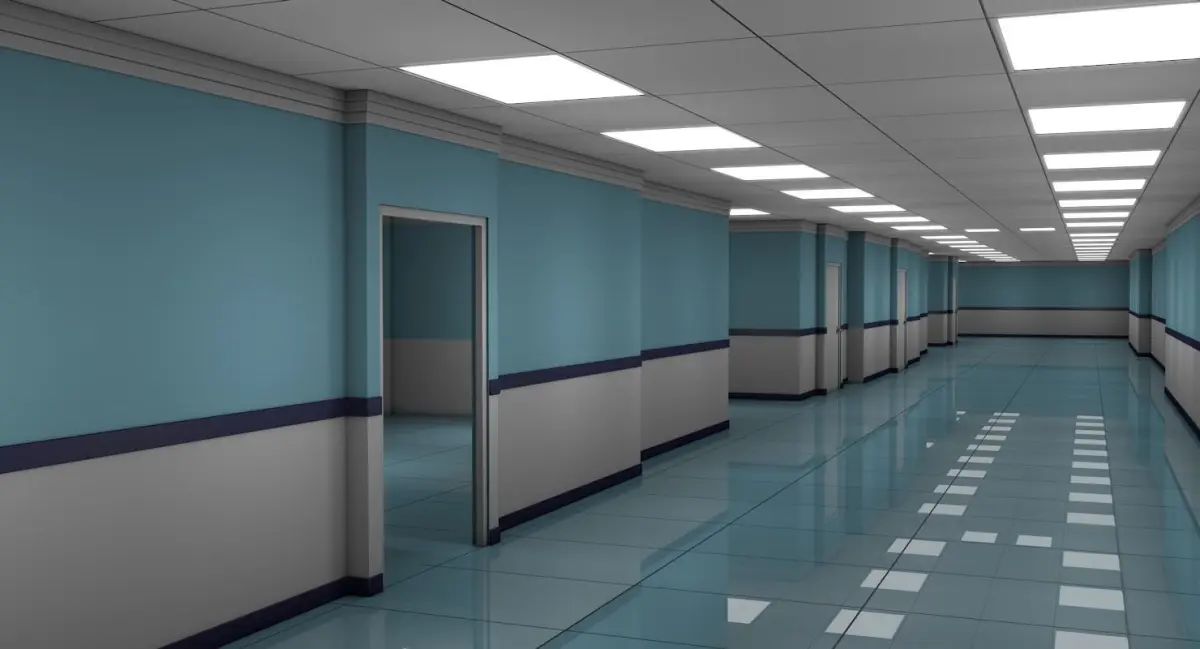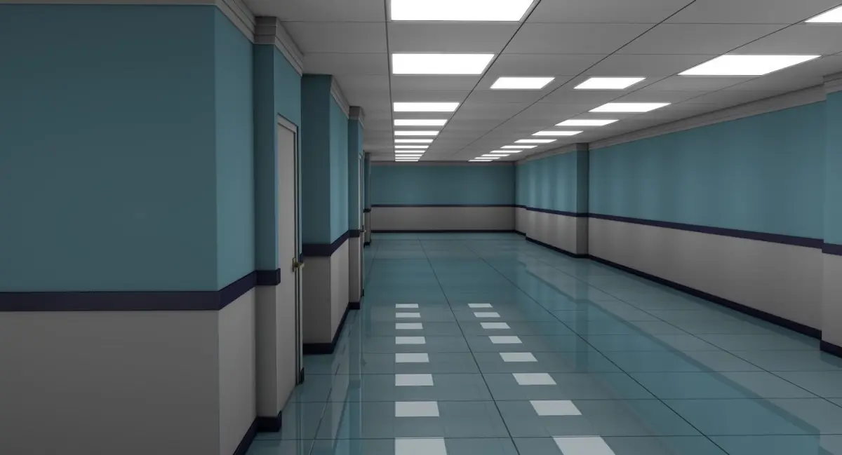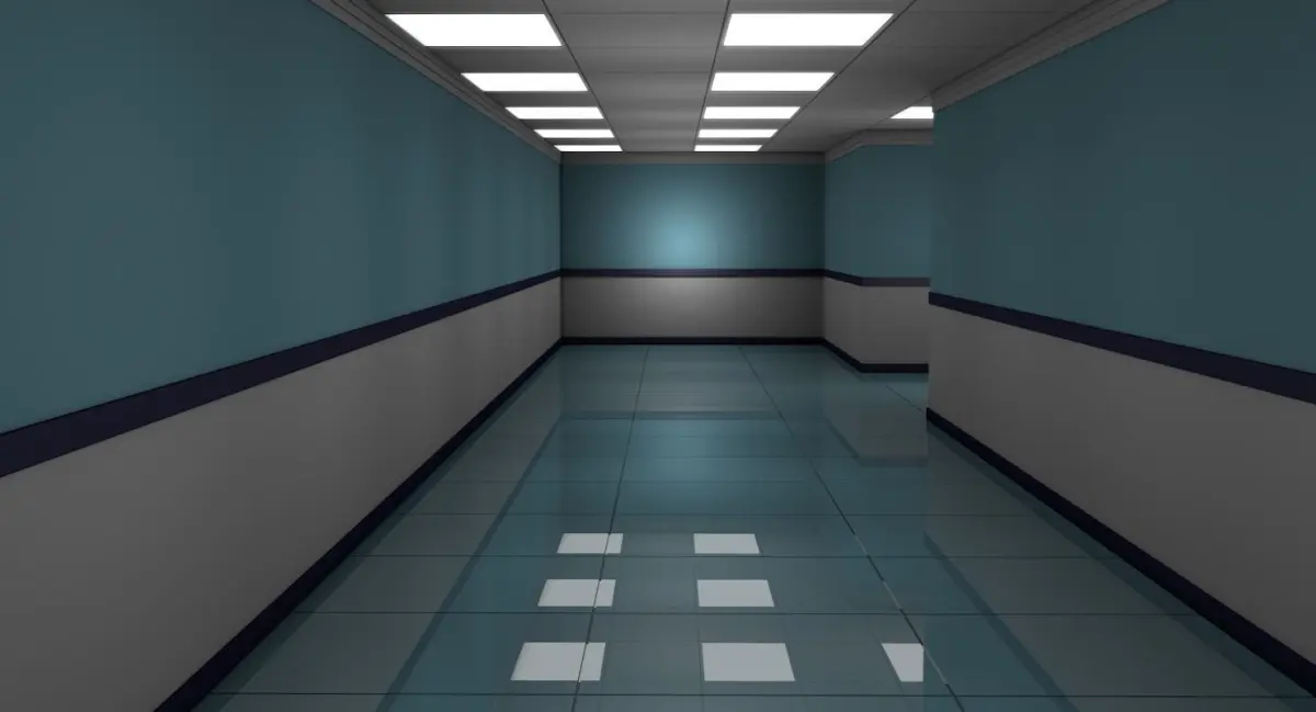 This is a 3d model of an Apartment Hallway with 4 empty Rooms.