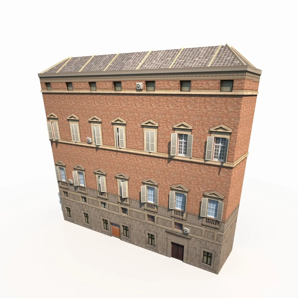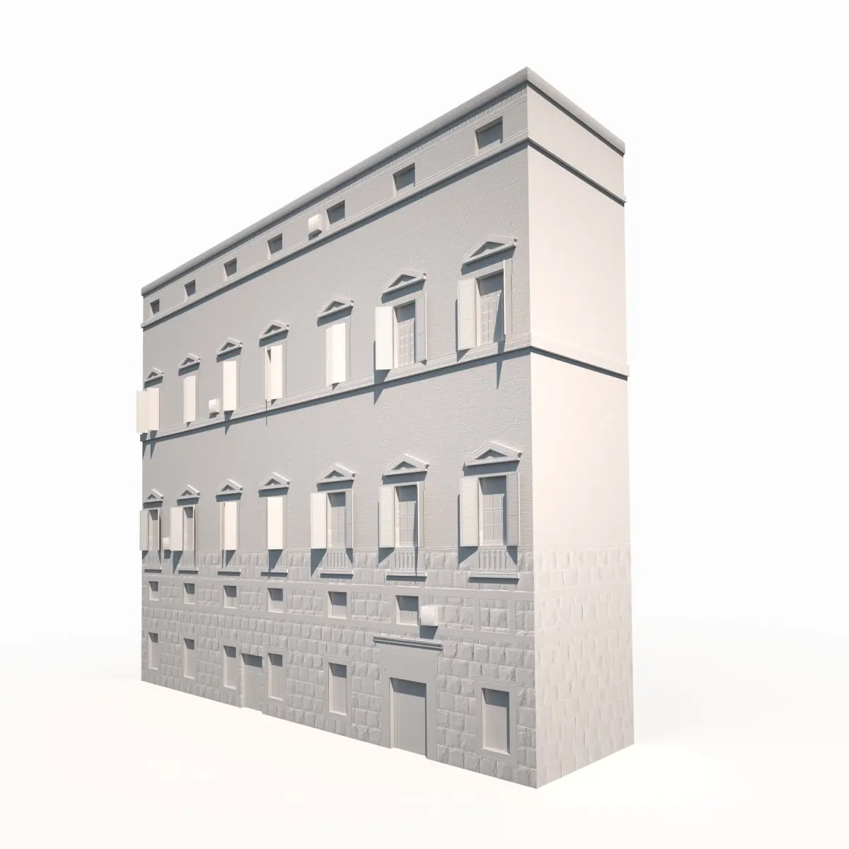A 3D model of a low poly old building facade. Exterior only, no interior.