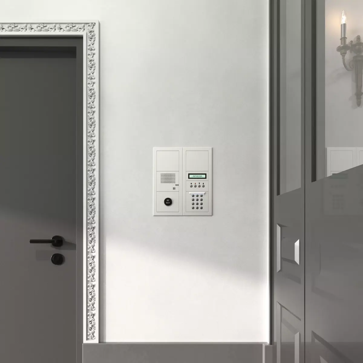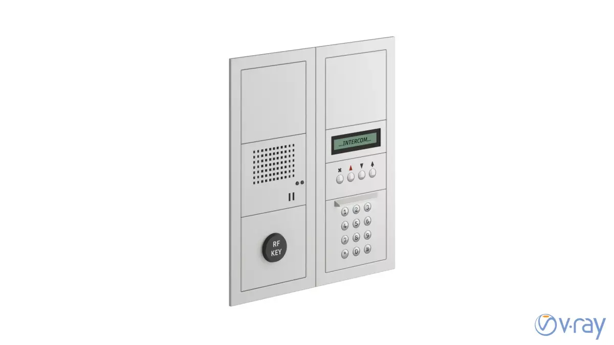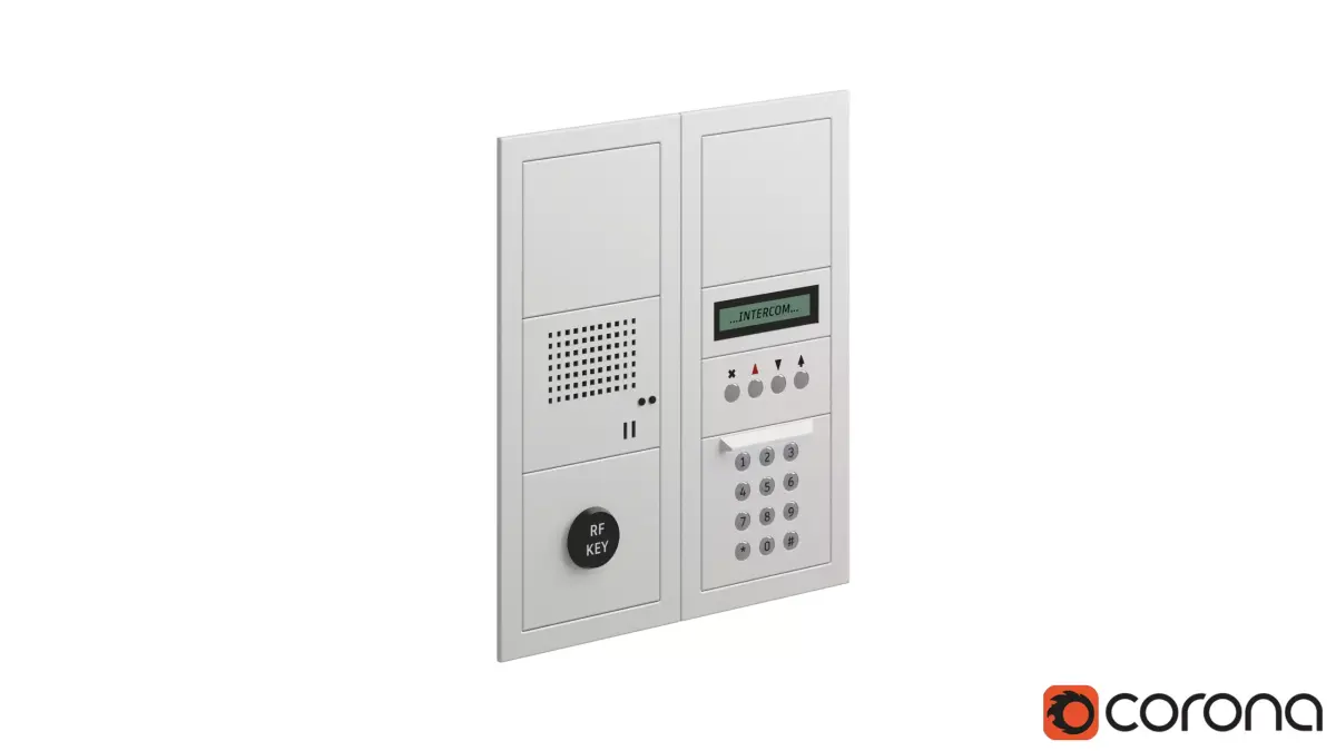 Every realistic apartment building scene needs this detail — a dual-panel intercom with RF ID reader, backlit keypad, and LCD display, ready to drop into any archviz or game environment.
