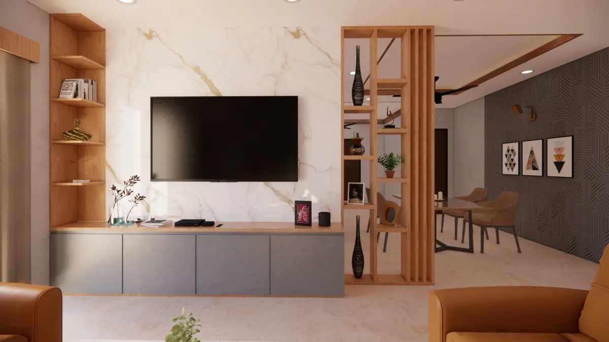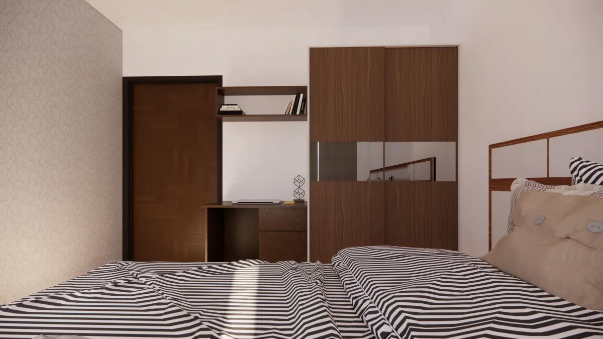 The model consists of a living area, dining area, and bedroom, designed in SketchUp and rendered using enscape and Vray. Detailed model with proper materials.