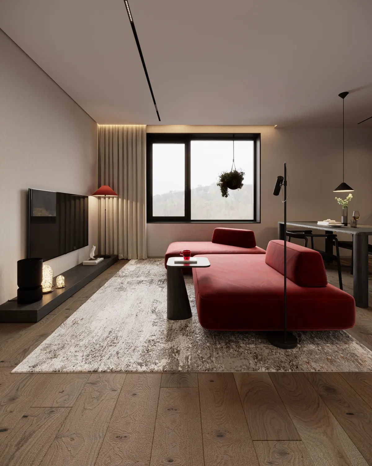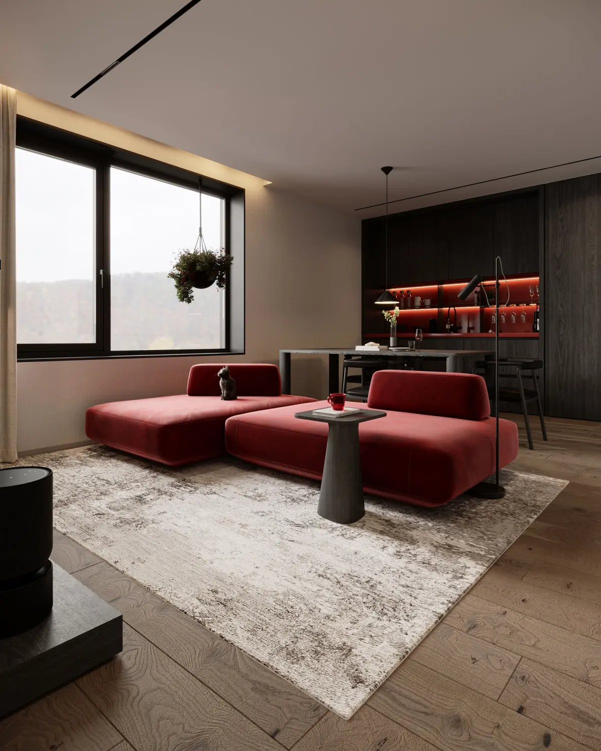 The 'Berry Blend' interior design concept fuses the richness of red berry tones with the elegance of minimalism, creating a space that feels both vibrant and serene. Deep cranberry, raspberry, and muted cherry hues are used as accent colors against a backdrop of soft neutrals like warm whites, sand, and light greys, allowing the bold tones to shine without overwhelming the senses.