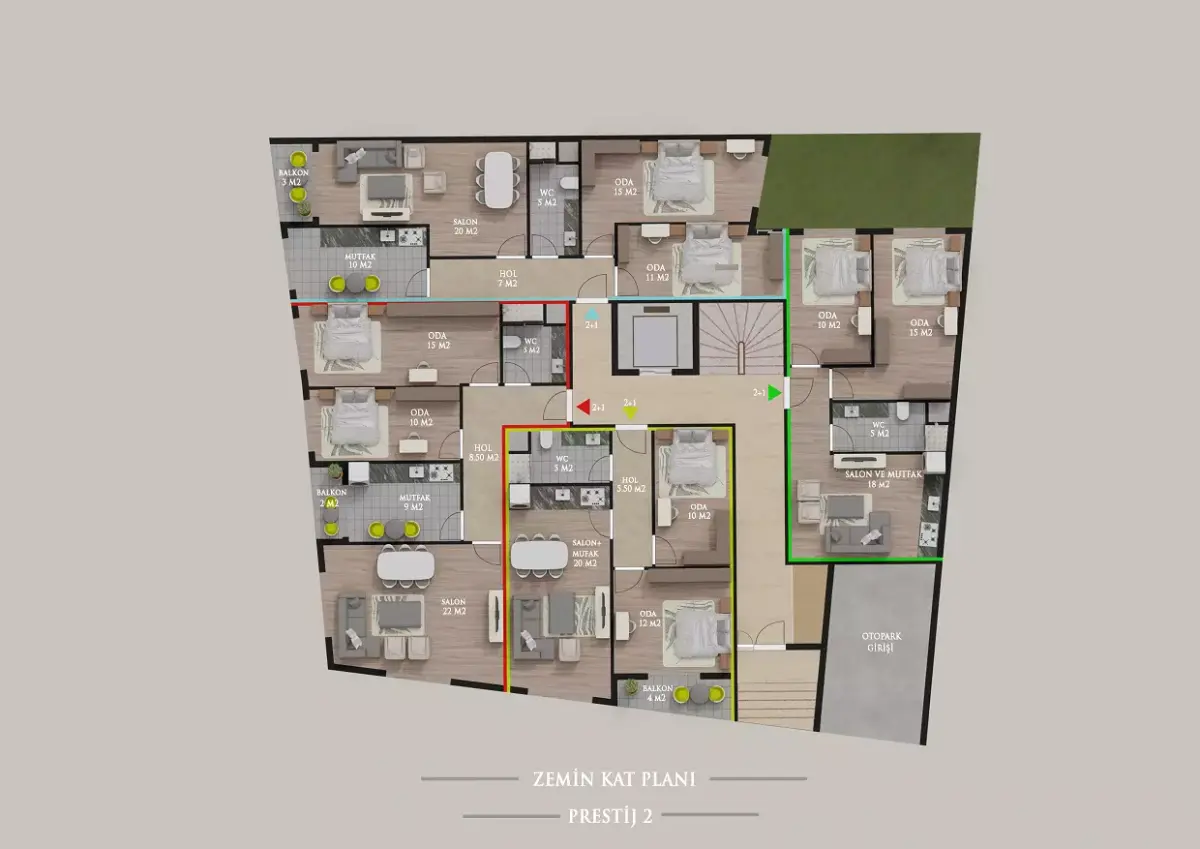 Bu paket, tam kapsamlı bir apartman projesini içerir ve tamamen özgün bir tasarımdır. Model SketchUp (.skp) formatında sunulmaktadır ve ticari kullanım için uygundur. Kat planları JPEG olarak tefrişli ve renklendirilmiş şekilde eklenmiştir.