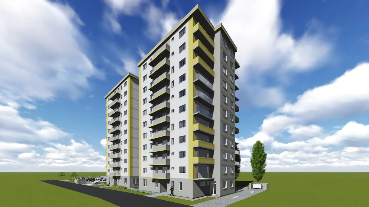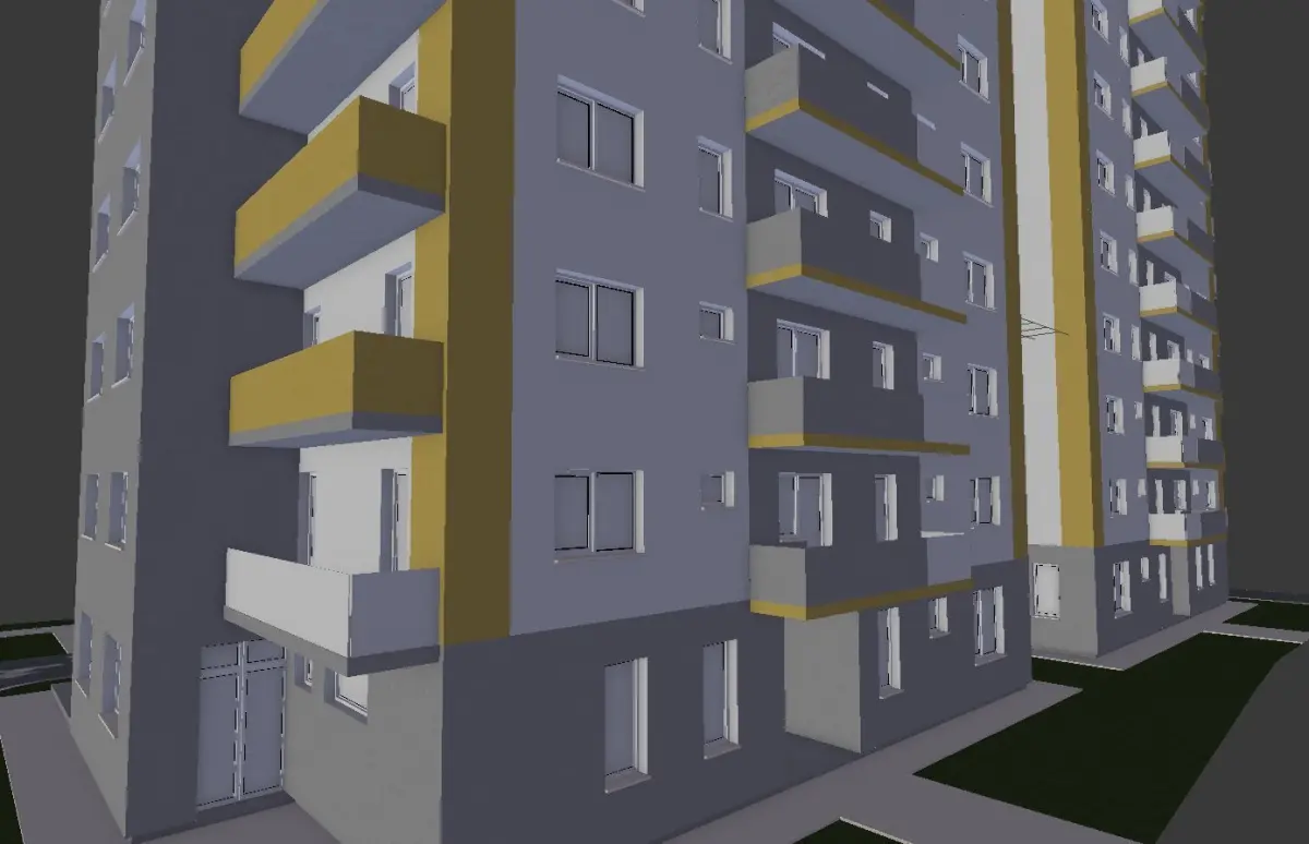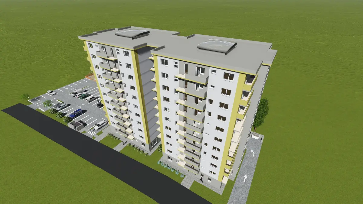 3D model of a ten floor building.This was modeled in Blender from 2D plans with real scale dimensions. this is a real building located in Romania.- parking lot- interior walls for each floor- i did not include interior doors and baths because of the heavy scene issues, but you can customize and add what you wish.- other objects like cars and people are added and rendered from Lumion.- HI-Res textures included