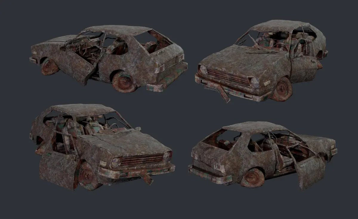 Model of an abandon car, unwrapped with PBR textures. OBJ files and FBX files. Ready for use in any 3D software or game engine. Unwrapped: Non- Overlapping.