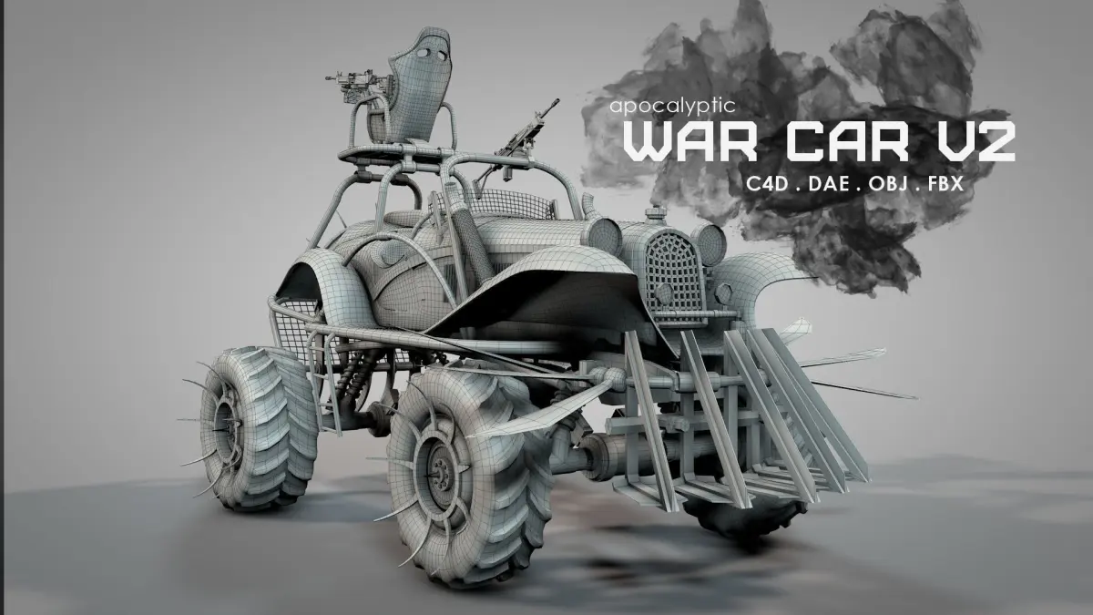 warcar2(SOURCE).C4D is the main file for Cinema 4D users. No textures or objects were baked. This needs TEX folder for texturing.