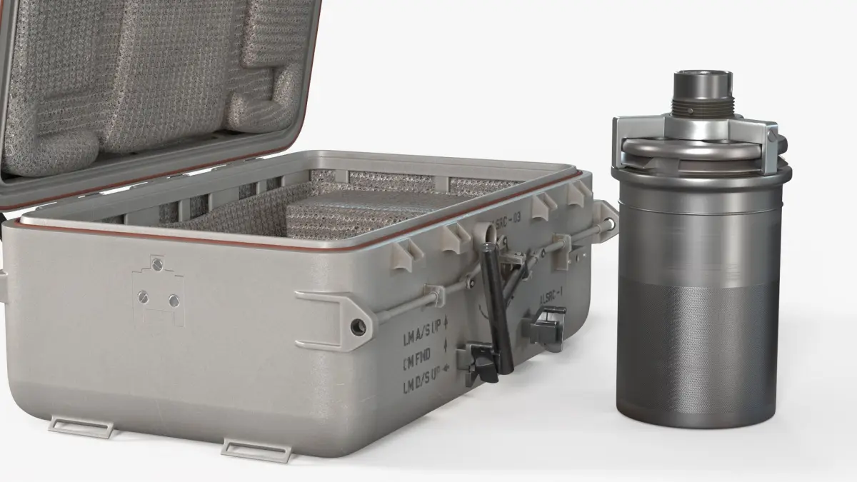 The model accurately depicts the iconic cylindrical vacuum-sealed canister with detailed textures, metallic finish, locking mechanisms, and a robust protective case lined with foam for impact resistance. The outer case includes realistic hinges, latches, handles, and engraved technical markings, reflecting the authentic engineering of aerospace-grade storage equipment used in space missions.