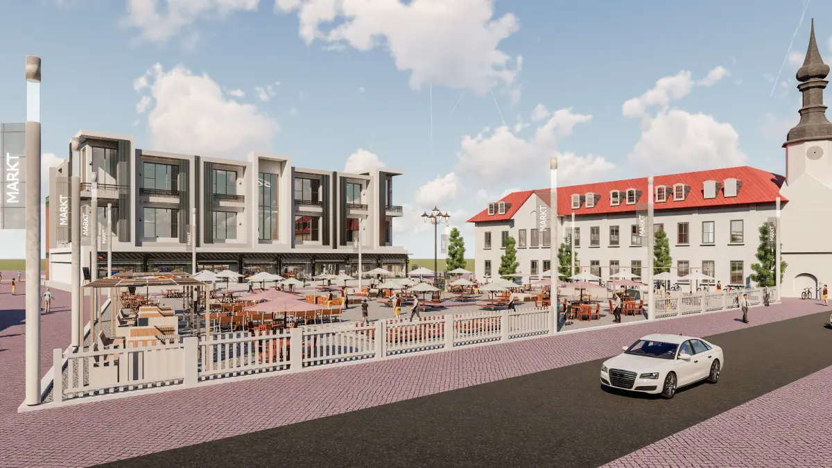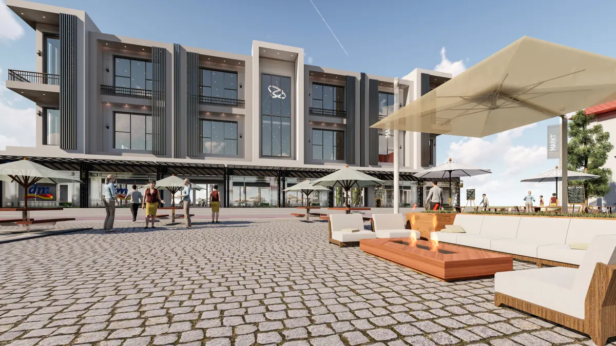 Its a commercial building with Modern facade Outdoor sitting area along fireplaces