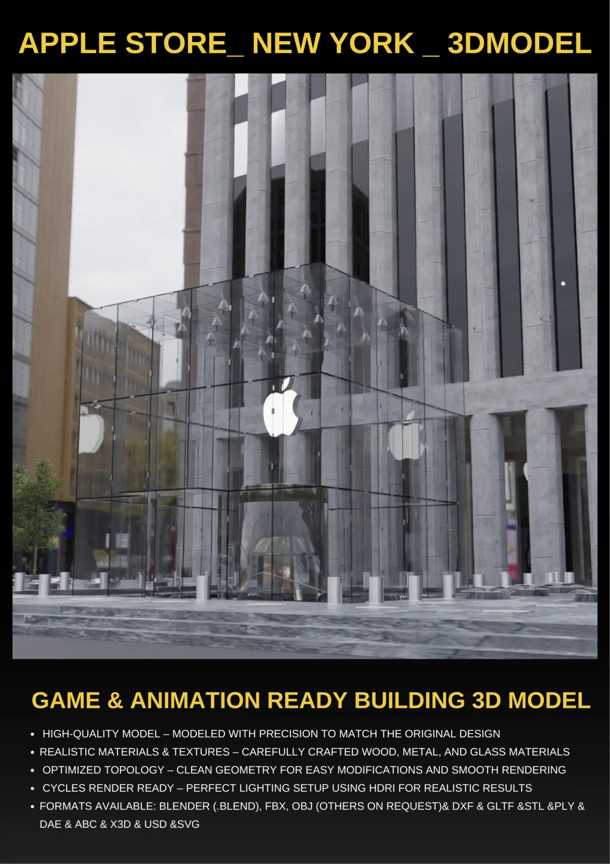 This is a highly detailed and accurate 3D model of the iconic Apple Store Glass Cube located at Fifth Avenue, New York City. Modeled with precision based on satellite data, architectural references, and floor plans to ensure maximum realism and accuracy.