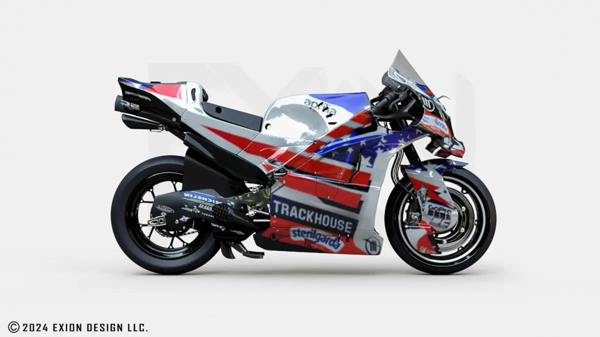 We designed this highly accurate 3D racing bike model based on the Aprilia RS-GP Trackhouse Racing MotoGP 2024 team's design and modeled it using 3DSmax.