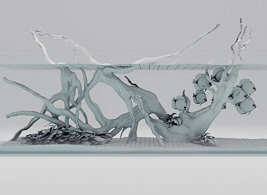 Photorealistic aquarium with discus and snags in hardscape performance.