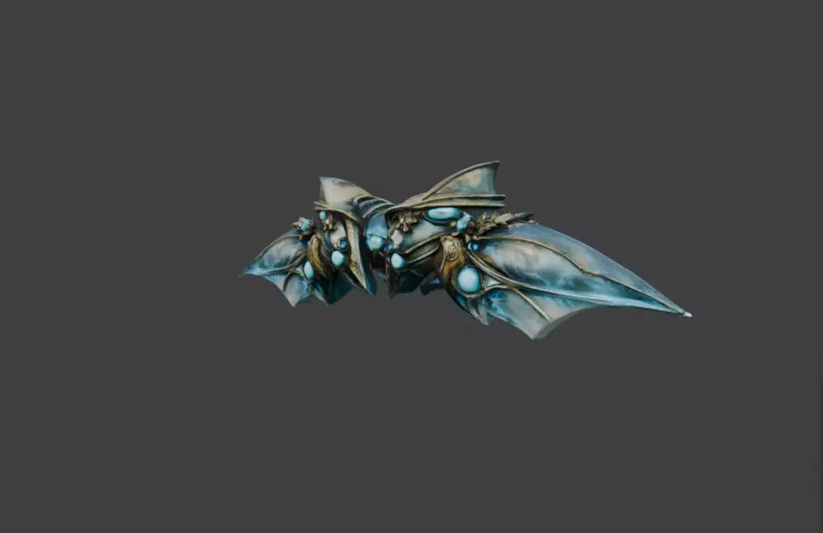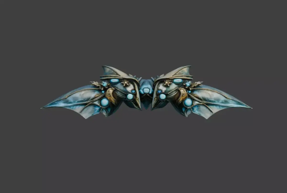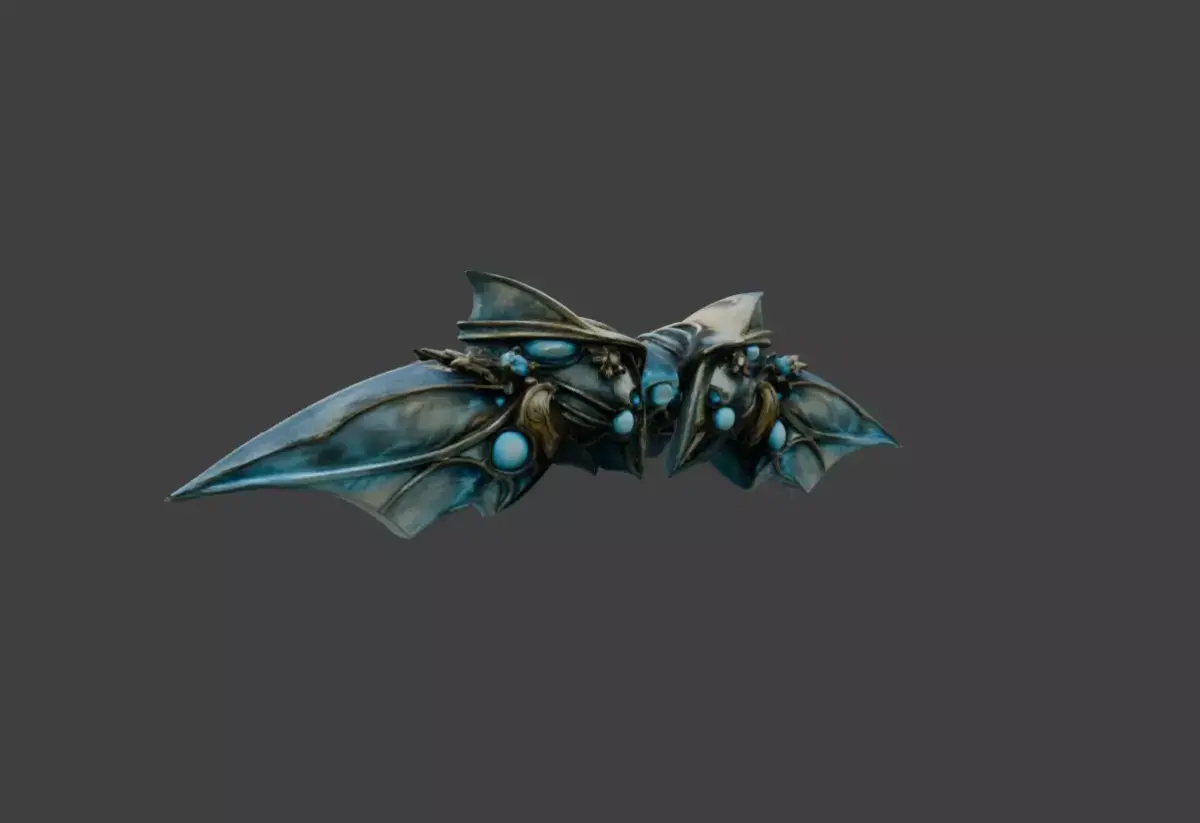 At first glance, the wings evoke the imagery of manta rays or deep-sea creatures, with wide, sweeping forms that suggest effortless gliding through both water and air. Their structure feels simultaneously organic and engineered, as if shaped by intelligent artisans who mastered the secrets of oceanic magic and bioluminescent energy. The layered surfaces resemble hardened fins or crystalline membranes, giving the wings a fluid silhouette that remains sharp and readable from any angle.