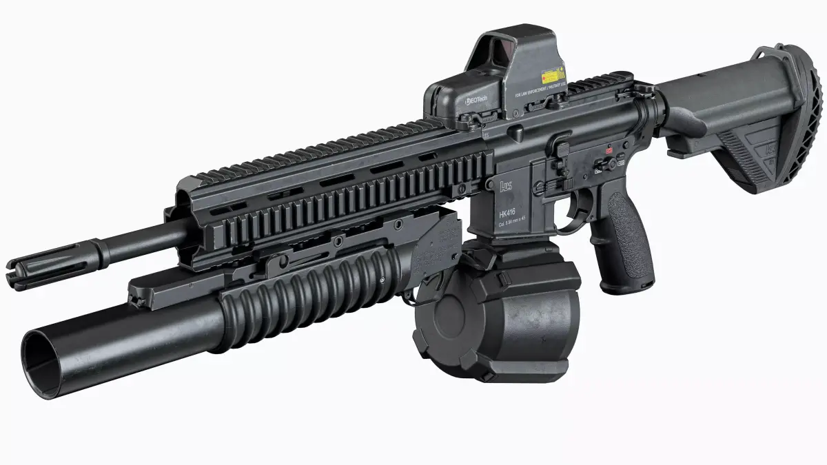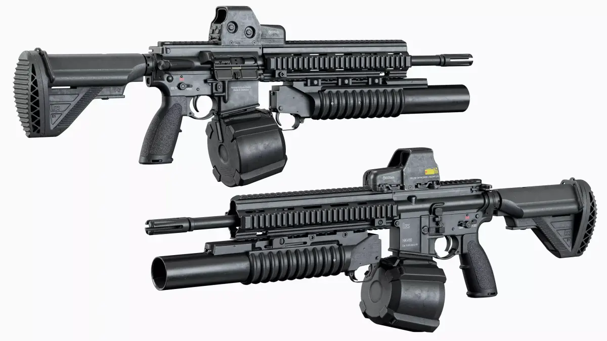 Game-Ready high-quality 3d model HK416 rifle 5.56 × 45 caliber with scope EOTech 553, magazine Magpul PMAG 60 rounds, grenade launcher M203 for Unreal Engine, Unity and other PBR game engines, renderers, first Person Shooters, VR games, and your other projects.