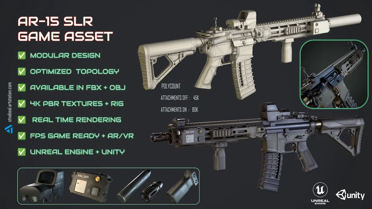 The AR-15 SLR Modular Game-Ready Rifle model includes AR-15 SLR base rifle with additional modular attachments. The model is optimized for use in real-time game engines like Unreal Engine or Unity. It's suitable for both first-person and third-person shooter perspectives, cinematic renders, or VR/AR applications.