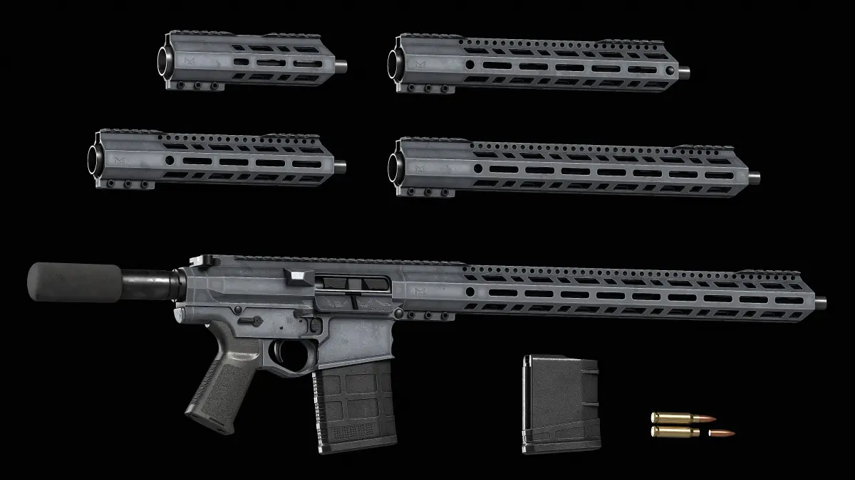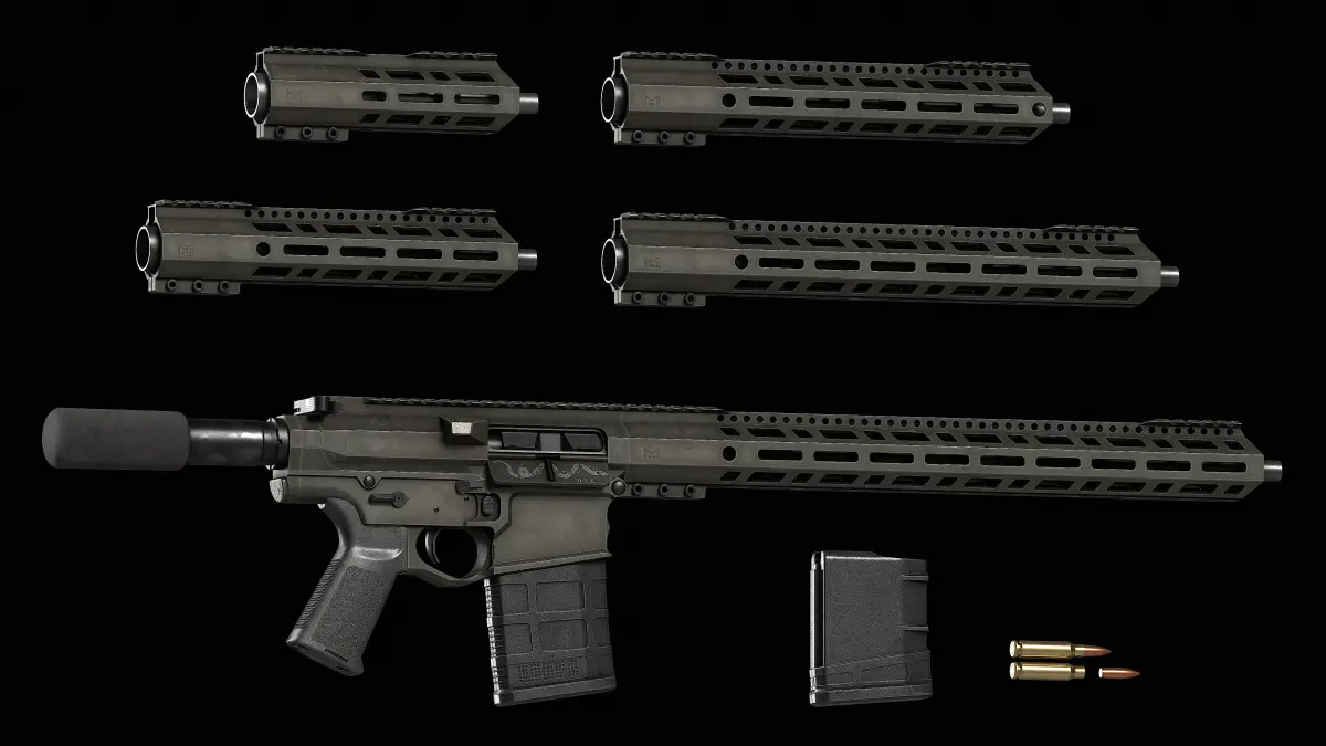 Handguard 7in : 6,172 Tris.Handguard 10in : 11,020 Tris.Handguard 12in : 13,308 Tris.Handguard 15in : 15,324 Tris.Handguard 18in : 20,010 Tris.SM_AR_LR_308 : 9,456 Tris.SM_Magpul_MOE_Grip : 9.732 Tris.SM_Pistol_Buffer_Tube : 1.030 Tris.Pmag : 2.876 Tris.