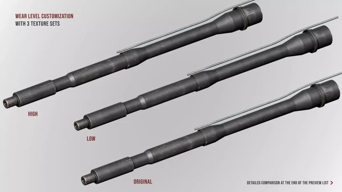 The original wear shows the texture and asset as initially intended. The low wear reduces the visible wear without removing it completely, and the high wear increases wear to a realistically high level. Wear reflects not only scratches but also other mechanical damage, dirt, dust, and other effects typical for firearms.