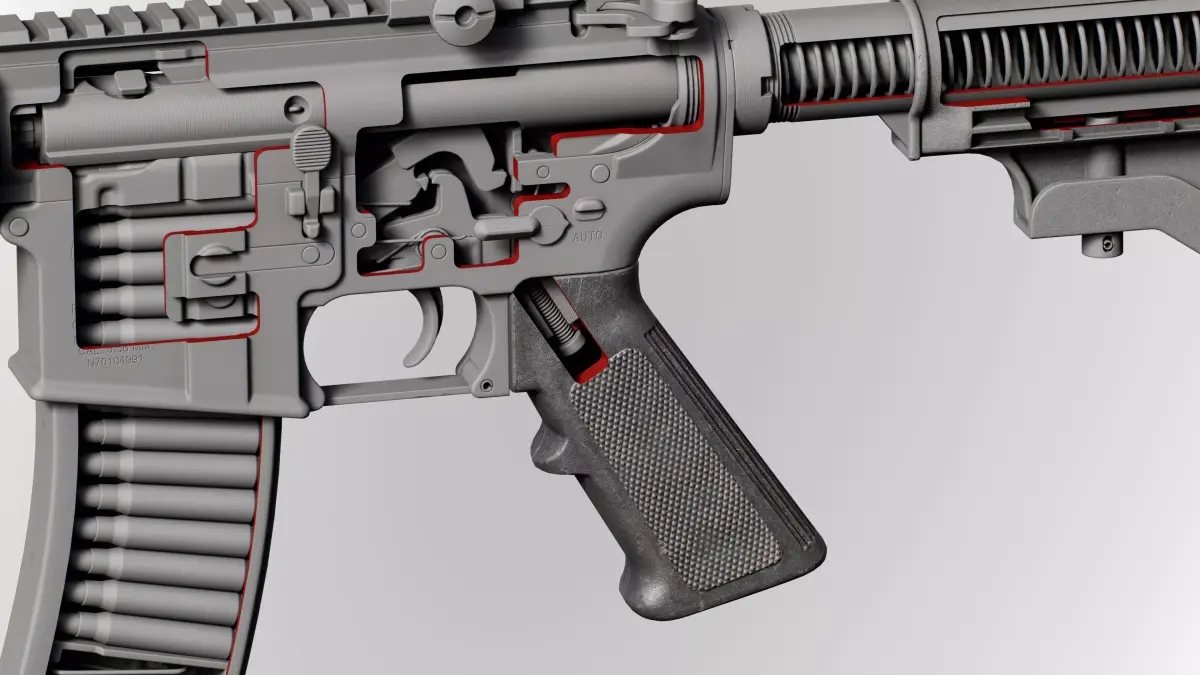 This assembly is unique due to its modularity, allowing parts to be replaced or integrated into other projects. Full compatibility with M4A1 components from other authors cannot be guaranteed, but it is fully compatible with my own components.