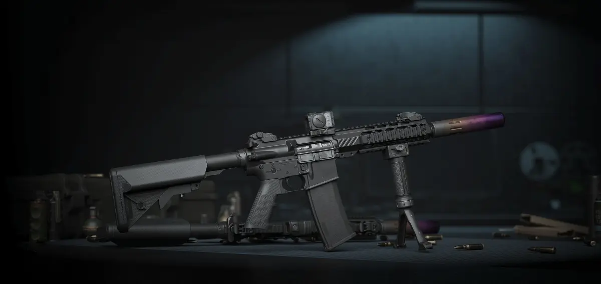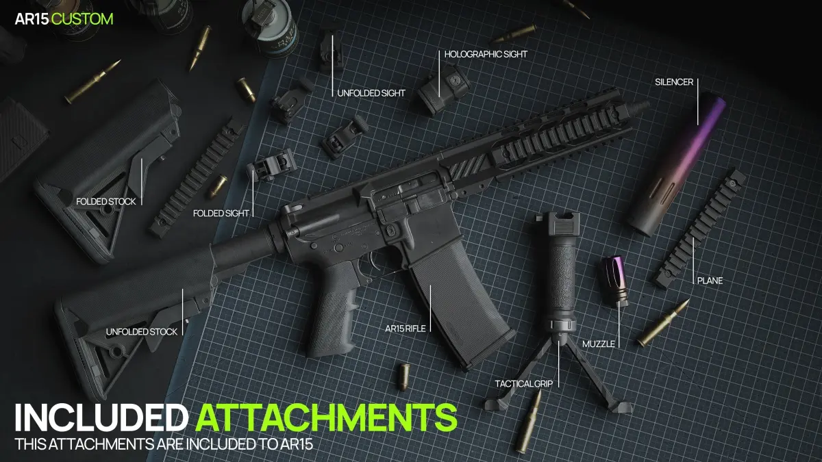 Game-Ready PBR(Metal-Rough)AR15 with 9 attachments(Silencer, Suppressor, Iron Sight(folded, unfolded), Holographic sight, Tactical Grip, Stock(folded, unfolded), pikatini plane).