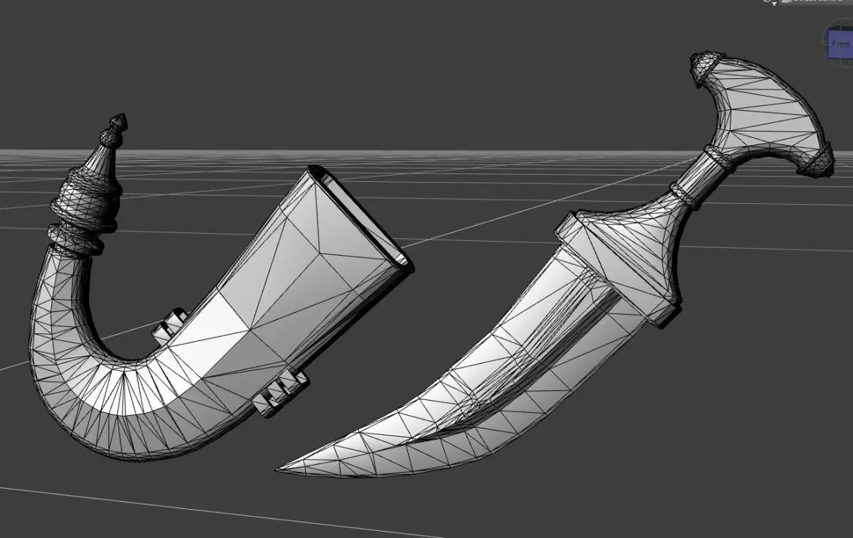 Arabian/Yemmeni dagger (called a Janbiya) Includes dagger and scabbard as separarte obj files. Texture to be reused as 'bump' layer to add impression of raised decoration (also needs to be given metallicity finish).
